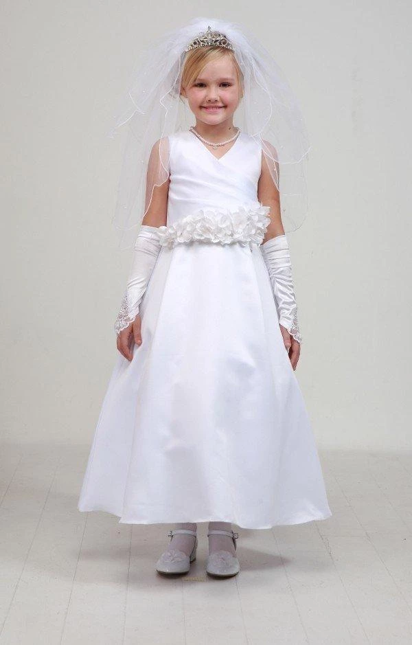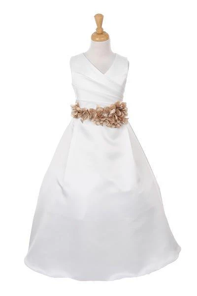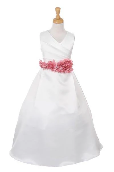 Your sweet girl will beam with joy in this long ivory V-neck satin dress with floral petal sash by Cinderella Couture. Elegant pleated floor length satin dress with an 80-inch ribbon sash adorned with flower petals.