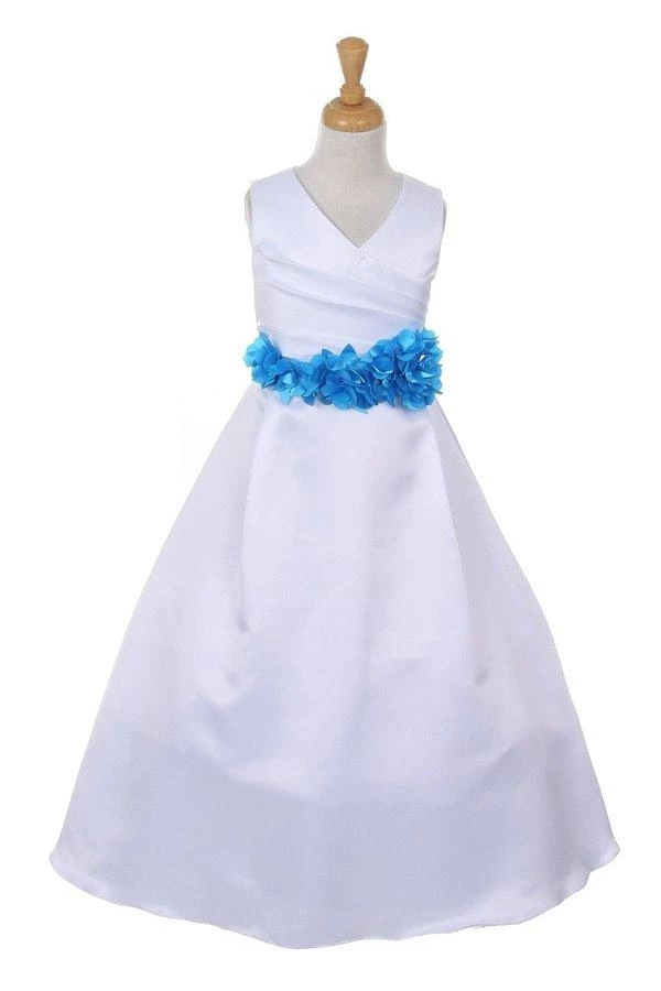 Your sweet girl will beam with joy in this long white V-neck satin dress with floral petal sash by Cinderella Couture. Elegant pleated floor length satin dress with an 80-inch ribbon sash adorned with flower petals.