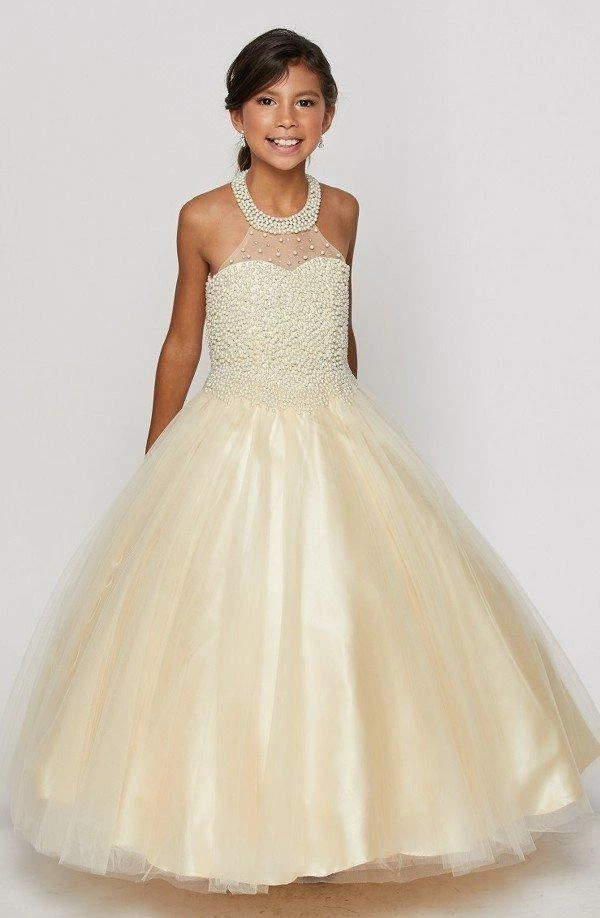 Your little girl will light up the room in this ball gown! Your precious girl will look lovely in this timeless pearl beaded tulle party dress. This halter floor length gown features a sheer neckline that is professionally crafted with a handmade pearl collar, the bodice is covered in pearl beads and is accented with beads, a modest open back with crisscross pearl beaded straps, the full length A-line tulle skirt is sprinkled with dainty pearl beads, and an adjustable lace-up corset back.