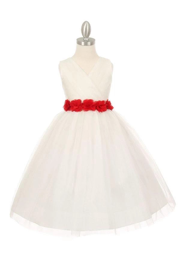 Your sweet girl will receive lots of compliments in this ivory pleated V-neck tea length dress with flower sash by Cinderella Couture. This shiny tulle dress features a sleeveless pleated V-neck bodice, chiffon flower satin ribbon sash, enclosed back, tea length A-line skirt, and a zipper closure.