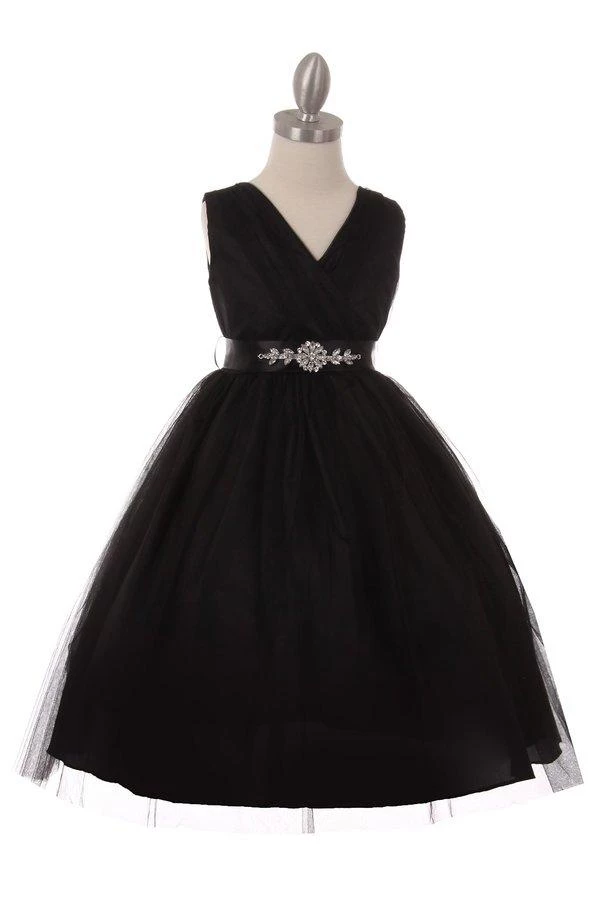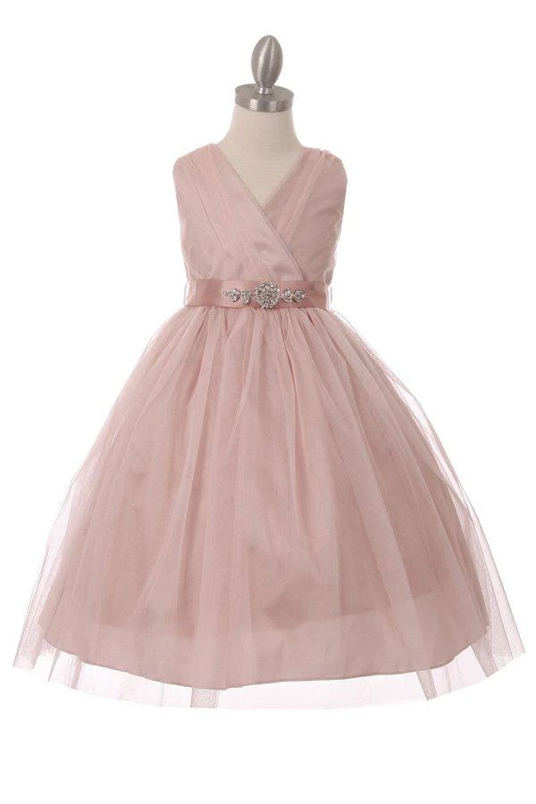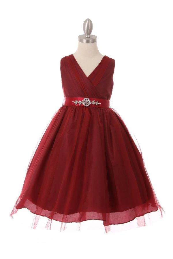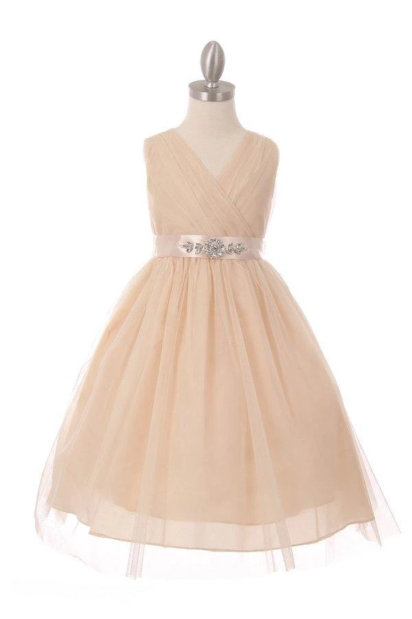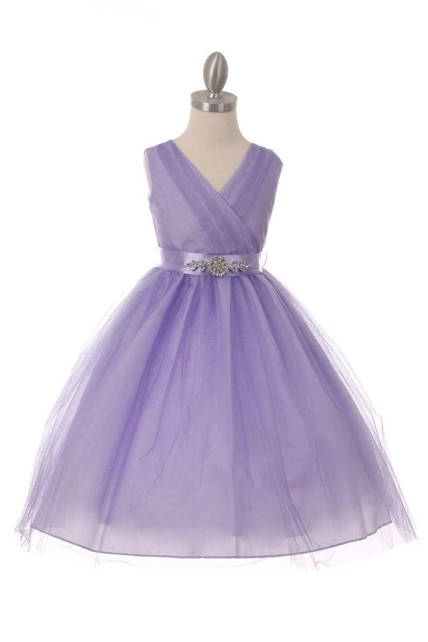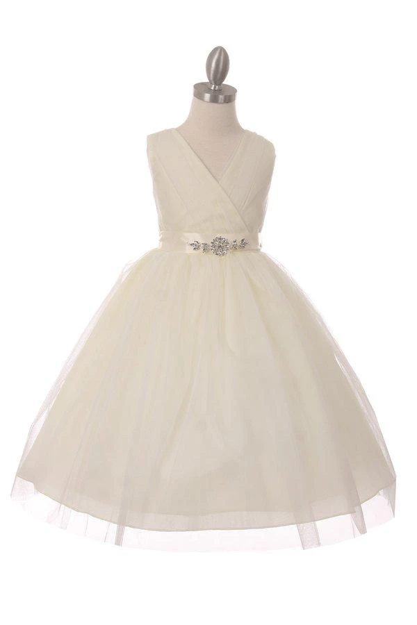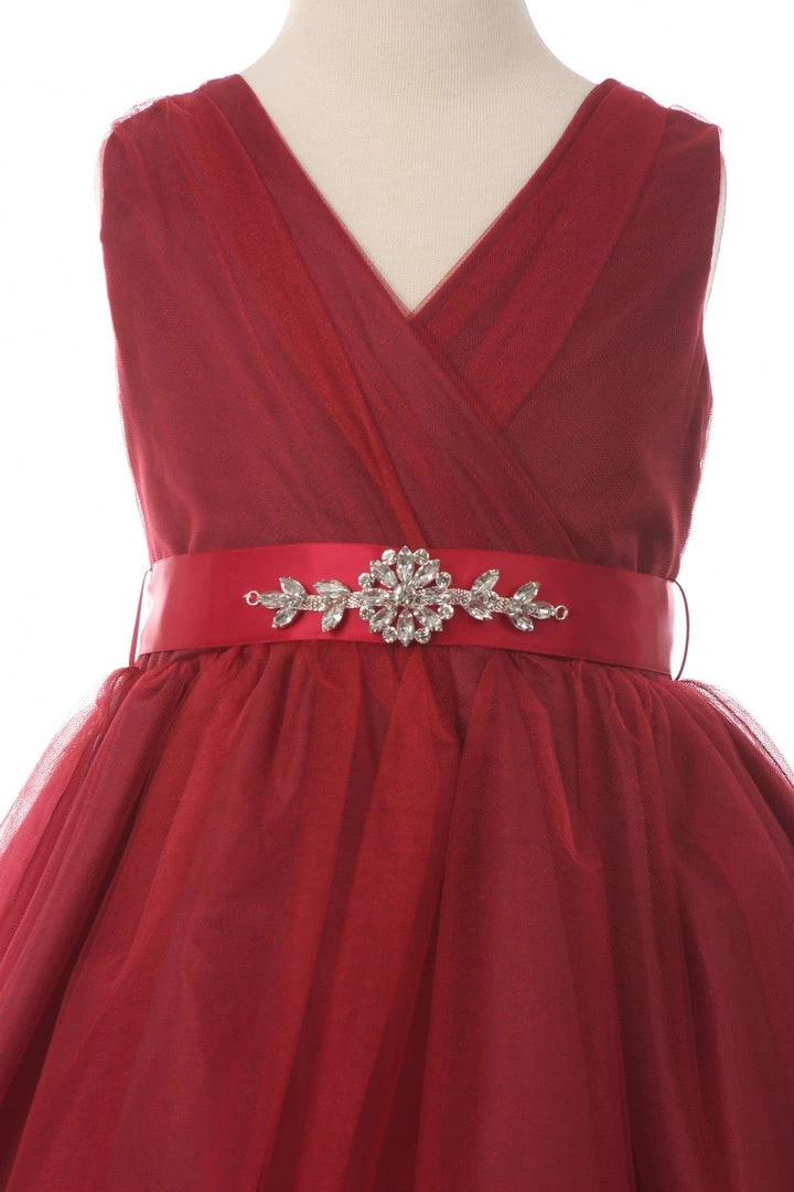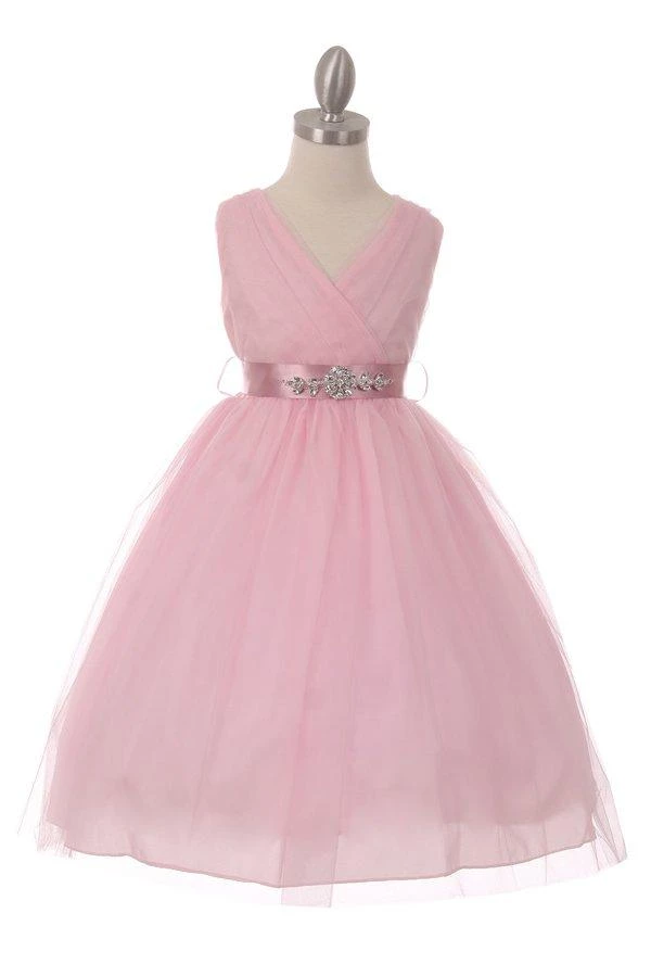 Your sweet girl will receive lots of compliments in this pleated V-neck tea length dress with rhinestone beaded sash by Cinderella Couture. This shiny tulle dress features a sleeveless pleated V-neck bodice, dazzling rhinestone beaded with double sided satin sash (72″ long), enclosed back, tea length A-line skirt, and an invisible zipper closure.