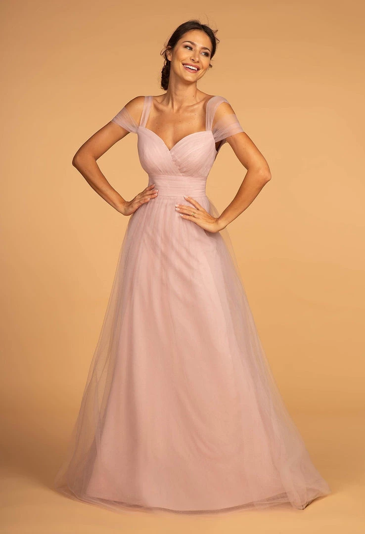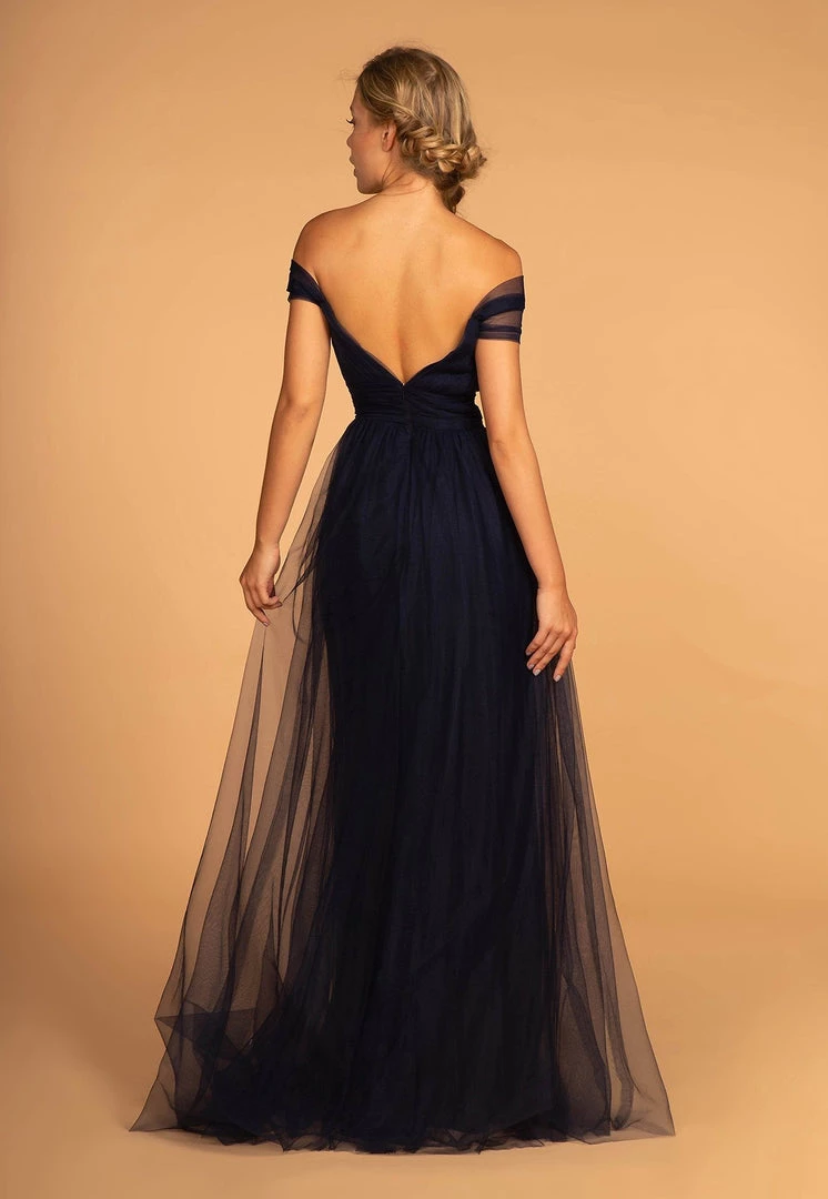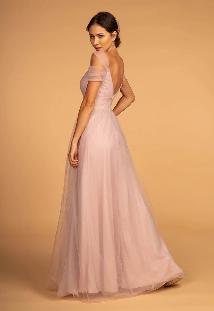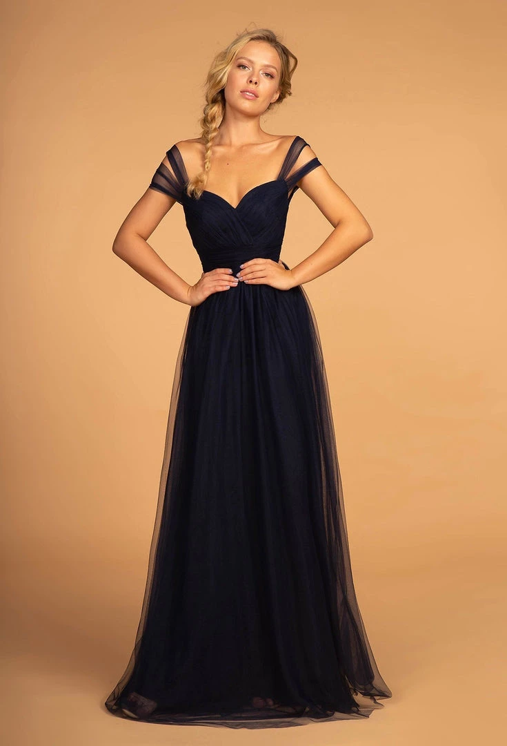 You’ll love twirling around in this cold shoulder tulle gown with ruched top by Elizabeth K GL2610. This long evening dress features a beautiful off-the-shoulder sweetheart bodice with wide tulle straps for security and support, lovely ruching details, a flirty open V-back, a floor length A-line skirt, and a zipper closure.