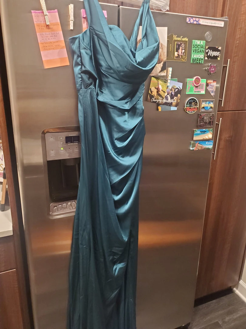 Look timeless in this long fitted convertible dress with leg slit by Cinderella Divine 7488. Made out of charmeuse, this beautiful dress features a draped bodice that can be worn in three ways: off-shoulder, asymmetric neckline, and sleeveless U-neckline. Draped pleats that are customizable cascade alongside the skirt that will drape beautifully on many body types.