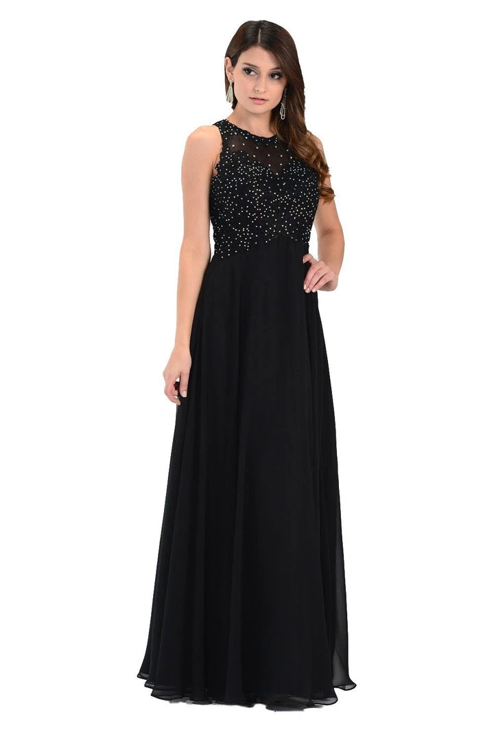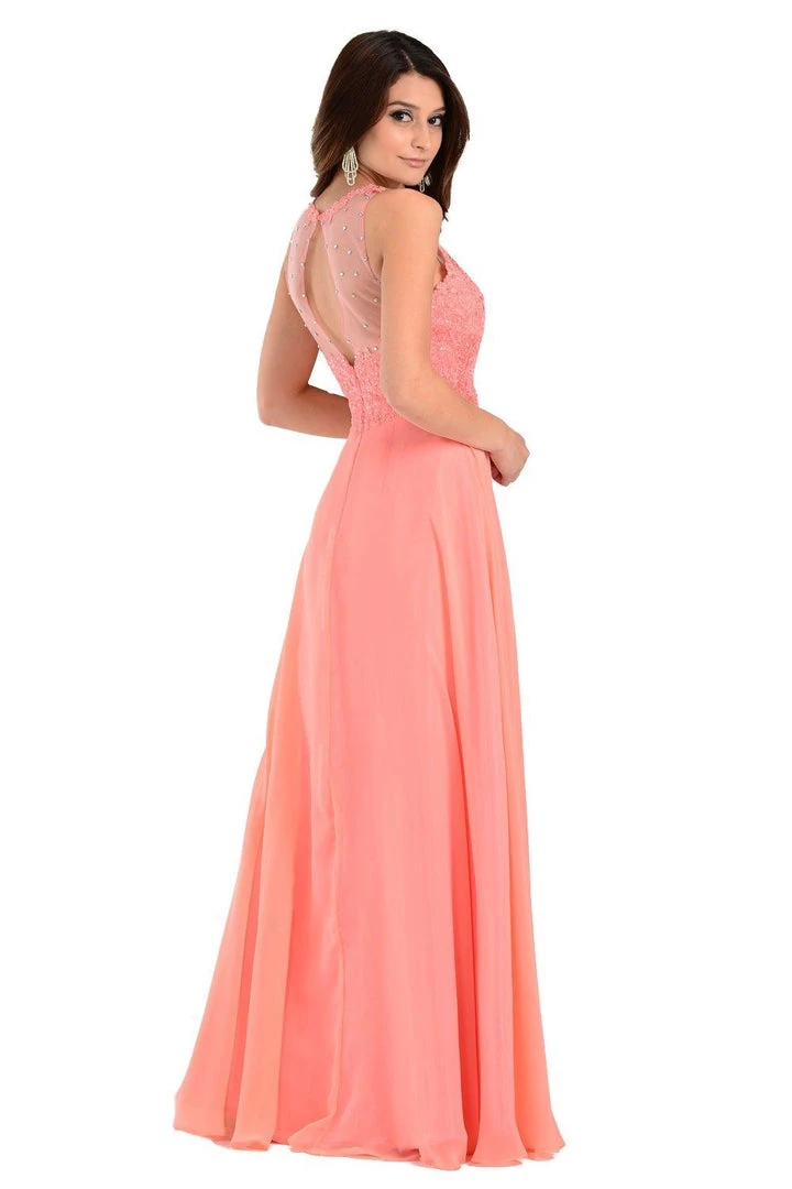 Be stunning in this long coral chiffon gown with lace appliqued bodice by Poly USA Style Number 7454. This long evening dress features a sleeveless bodice embellished with lace appliques and rhinestones. A sheer neckline, keyhole open back, a floor-length chiffon skirt, and a zipper closure complete this beautiful look. Perfect for any formal event!