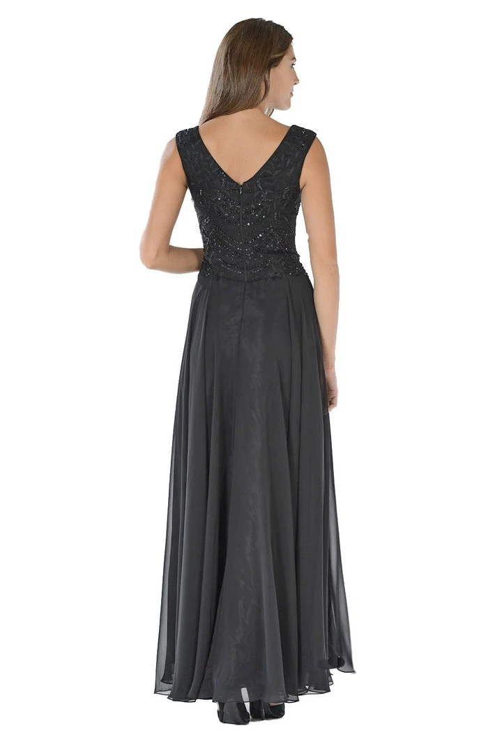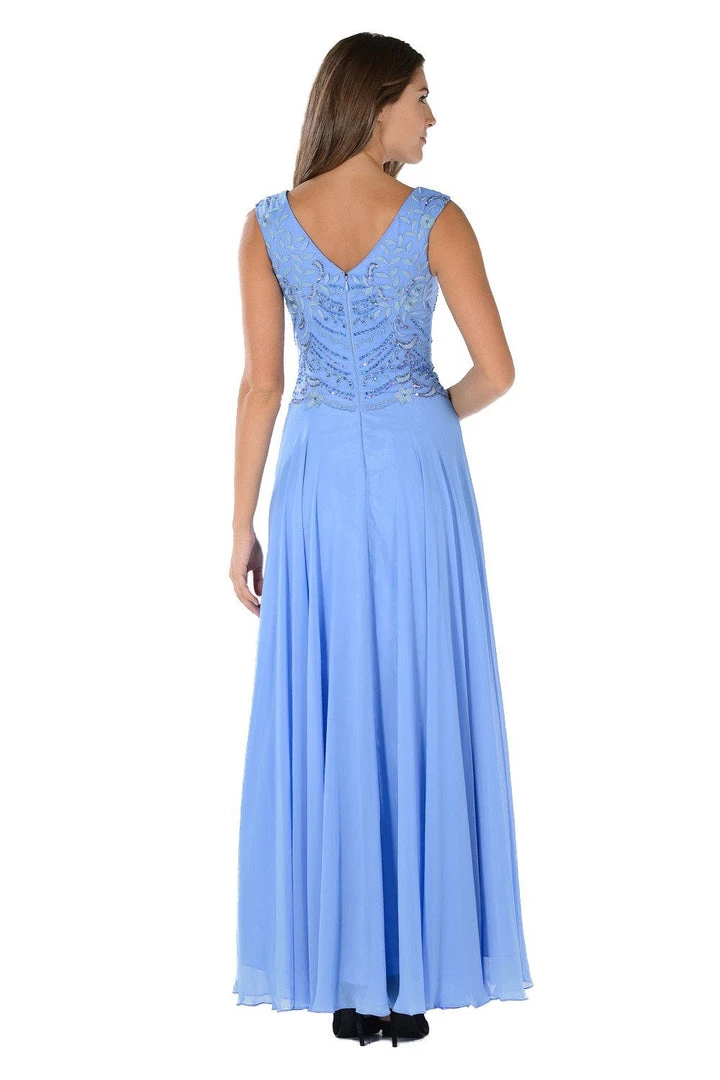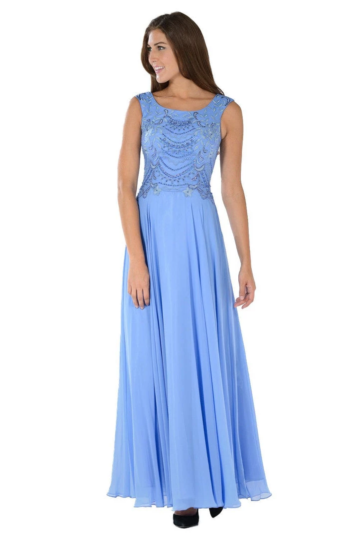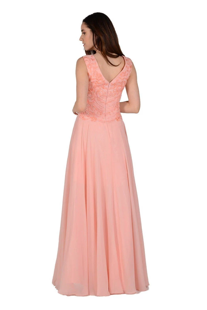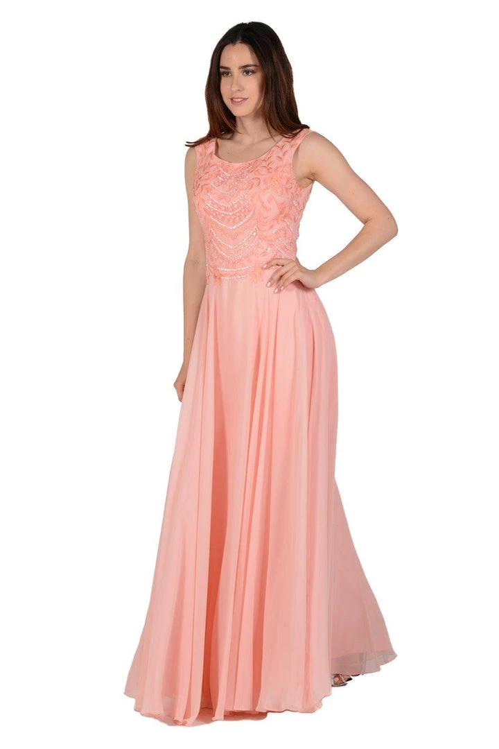 Look graceful and elegant in this sleeveless coral gown with embellished bodice by Poly USA 7810. This long chiffon evening dress features a sleeveless tank bodice adorned with embroidery accented with sequins. An embellished back, flowing floor-length skirt, and a zipper closure complete this beautiful look. Affordably priced under $200, this dress is perfect for any formal event and will keep you on budget!