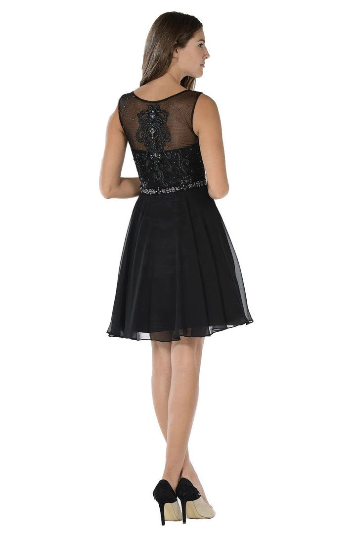 Look effortlessly elegant in this short coral chiffon dress with beaded bodice by Poly USA 7564. This cocktail dress features a sleeveless V-neck bodice embellished with intricate beaded appliques. A sheer beaded back, a short knee-length A-line skirt, and a zipper closure complete this beautiful look. Affordably priced under $200, this dress is perfect for any formal event and will keep you on budget!