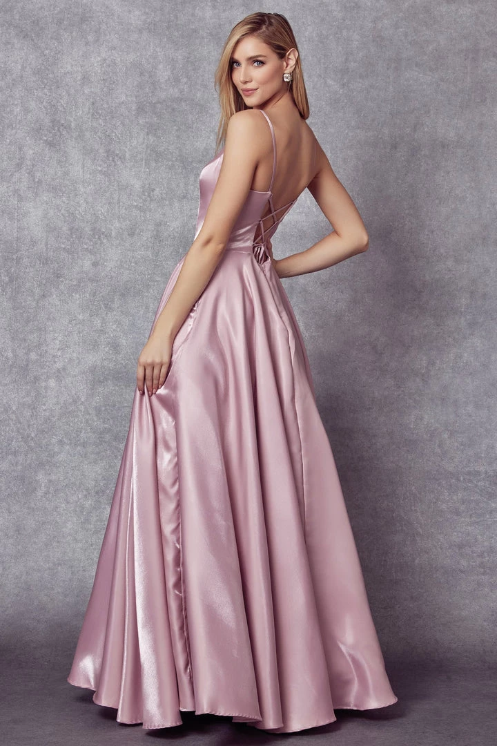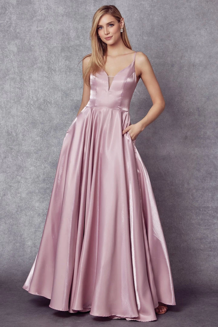 Look picture-perfect in this long sleeveless A-line corset style dress with fitted skirt and pockets by Juliet 223 The fashion-forward illusion deep-neck along with the open back design will make an elegant statement. This coreset style dress is finished with a lace up back and zipper closure.
