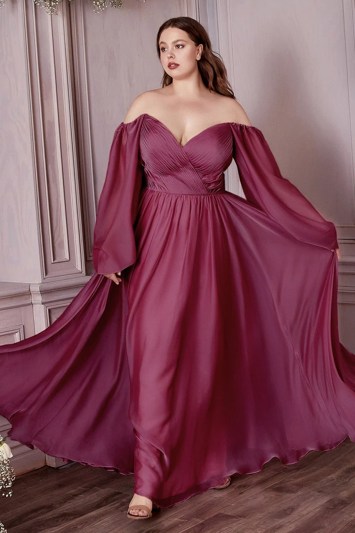 Look chic in this plus size long sleeve chiffon dress with A-line skirt by Cinderella Divine CD243C. Designed with fashion-forward details, this beautiful gown features a flattering sweetheart pleated bodice complemented with a sophisticated A-line skirt. The soft billowy sleeves can be worn off-or-on the shoulder, offering a versatile look. This dress is a must-have for any special occasion.