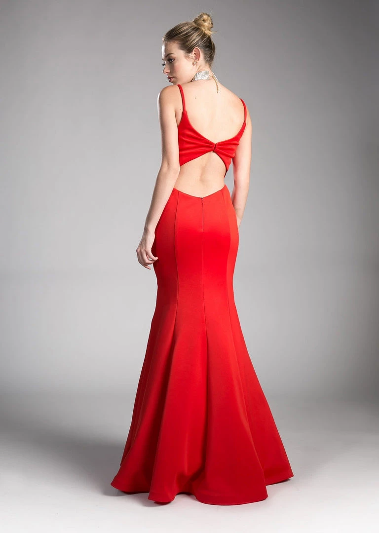 Dance the night away in this long sleeveless mermaid dress with open back by Cinderella Divine CE0009. This evening gown features a spaghetti strap sleeveless bodice adorned with keyhole accent around the midriff, a flirty open back with cut outs, a floor length mermaid skirt, and a zipper closure. Fitted stretch jersey gown with plunge neckline and waist cut out.