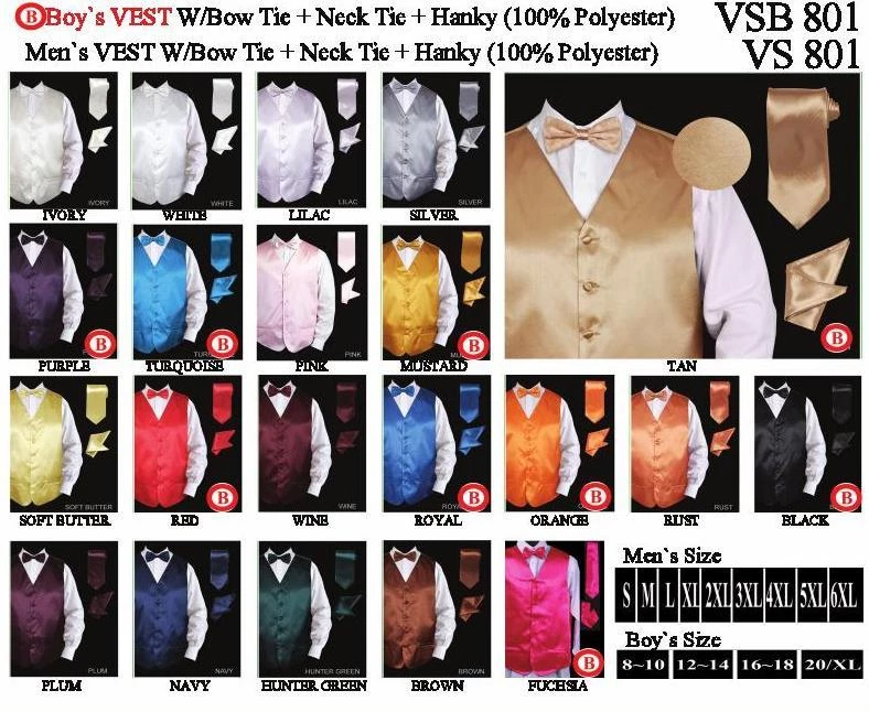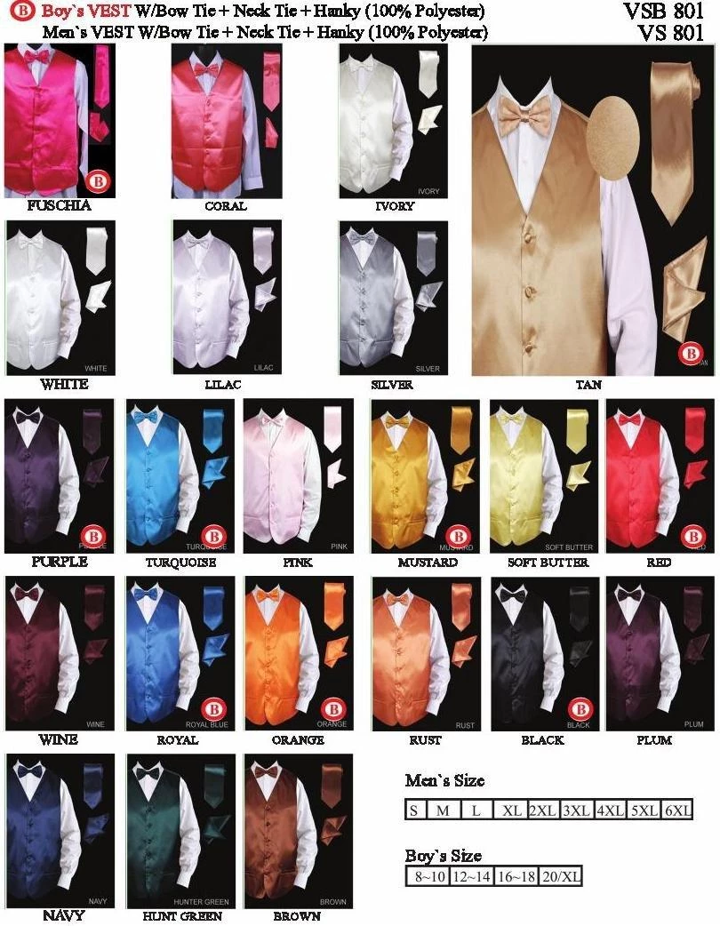 Men’s Solid Satin Vests with Matching Neck Tie, Bow Tie, and Pocket Square is a must-have when you need to look dapper for any formal occasion. Made out of 100% polyester, this men’s satin vests is great when you need to color coordinate outfits with people for a special event because it is available in many sizes and colors.