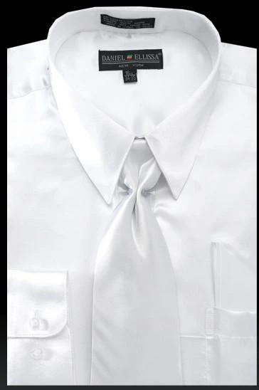 Classy and sleek, this men’s white satin dress shirt will complete your formal look to perfection. Designed by Daniel Ellissa, this shiny satin dress shirt is made out of 100% polyester, and features a spread collar, chest pocket, and button-front placket. Our customers love this shirt because it includes a matching necktie and handkerchief. This shirt is available in sizes, making it perfect for large group events such as: weddings, stage productions, and church events.