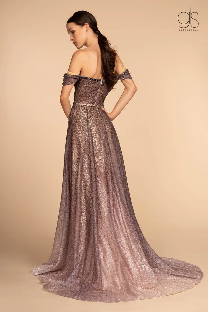 Turn heads in this embellished lace off shoulder a-line gown by GLS Gloria.