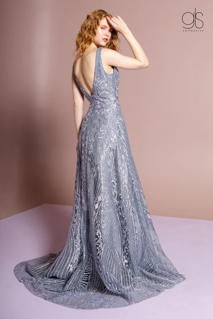 You’ll be the life of the party in this sleeveless glitter print gown with illusion v-neckline by GLS Gloria.