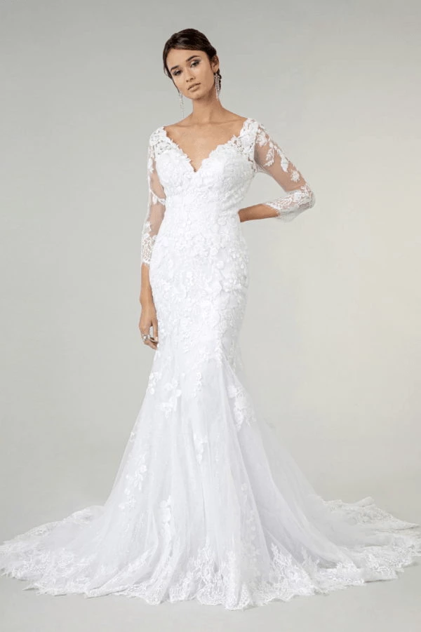 Look timeless in this long sleeve floral lace mermaid wedding dress by GLS by Gloria GL1932.