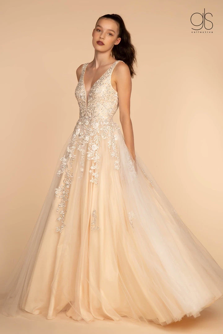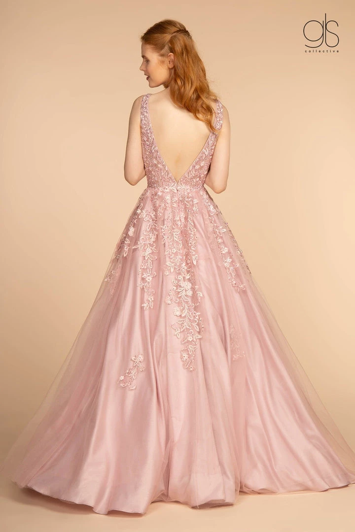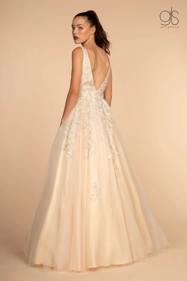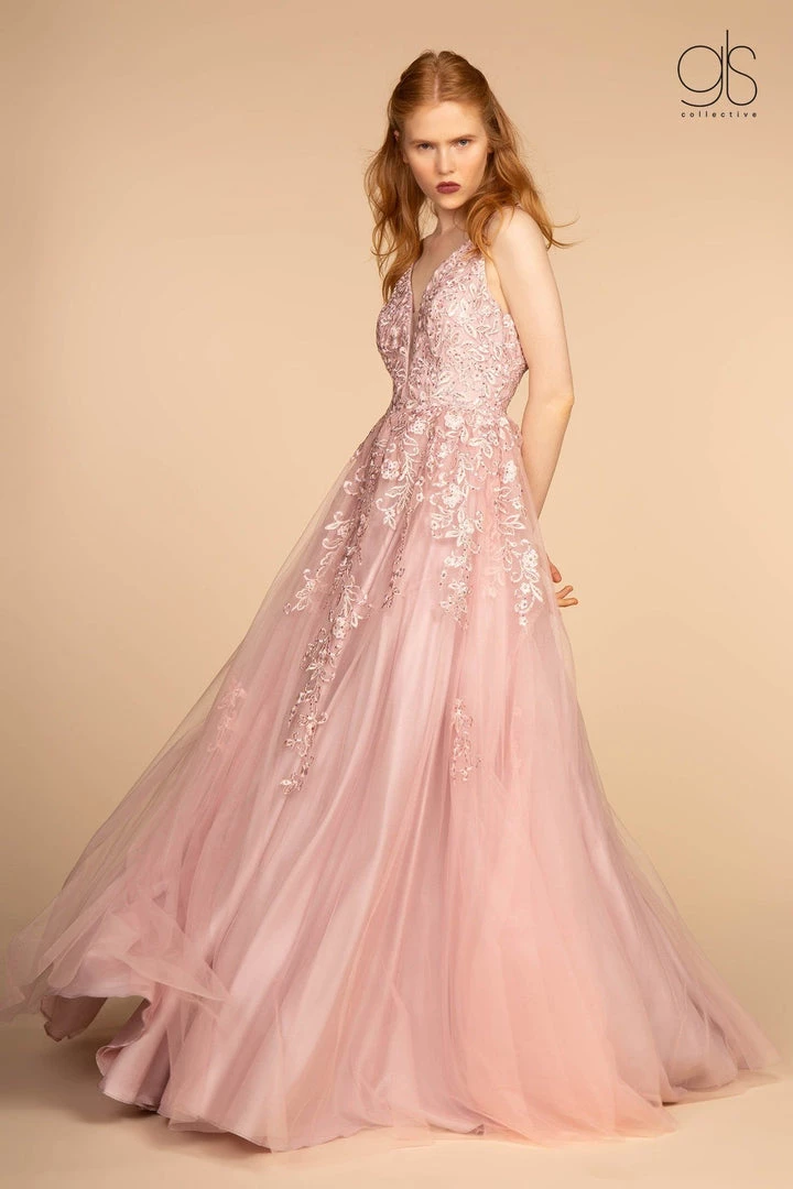 All eyes will be on you in this long sheer v-neck dress with floral embroidery by GLS Gloria.