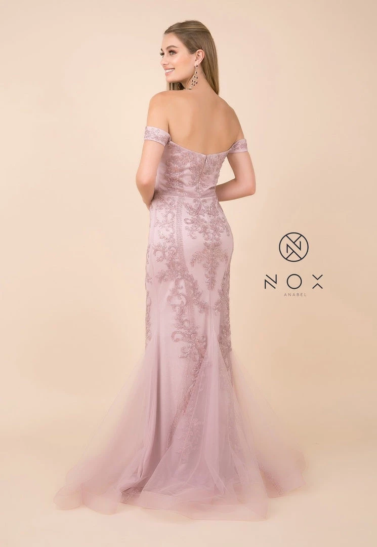 All eyes will be on you in this beaded long off the shoulder mermaid dress with tulle skirt by Nox Anabel H294.
