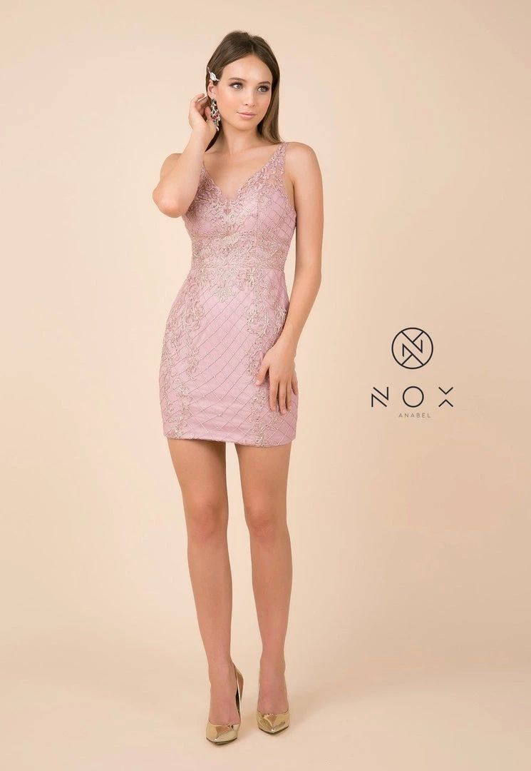 Look picture-perfect in this sleeveless V-neck cocktail dress with embellishments by Nox Anabel A673.