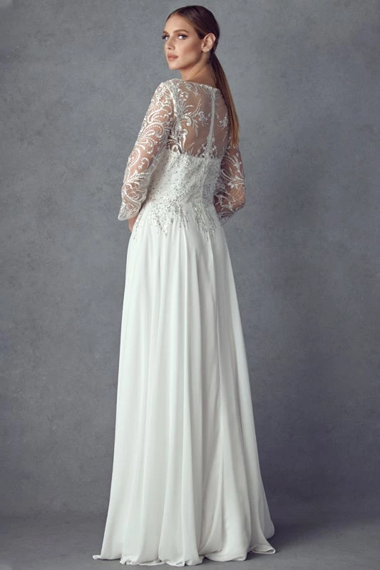 Captivate the room in this embroidered long sleeve white dress with A-line skirt Juliet M11W. This beautiful gown features a sheer sheer bodice, illusion 3/4 sleeves, enclosed illusion back, and a full length A-line skirt that ends in a sweep train.