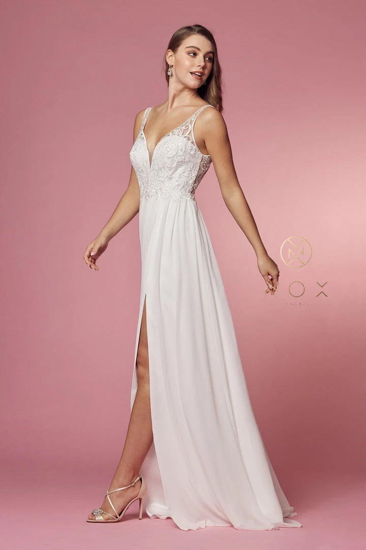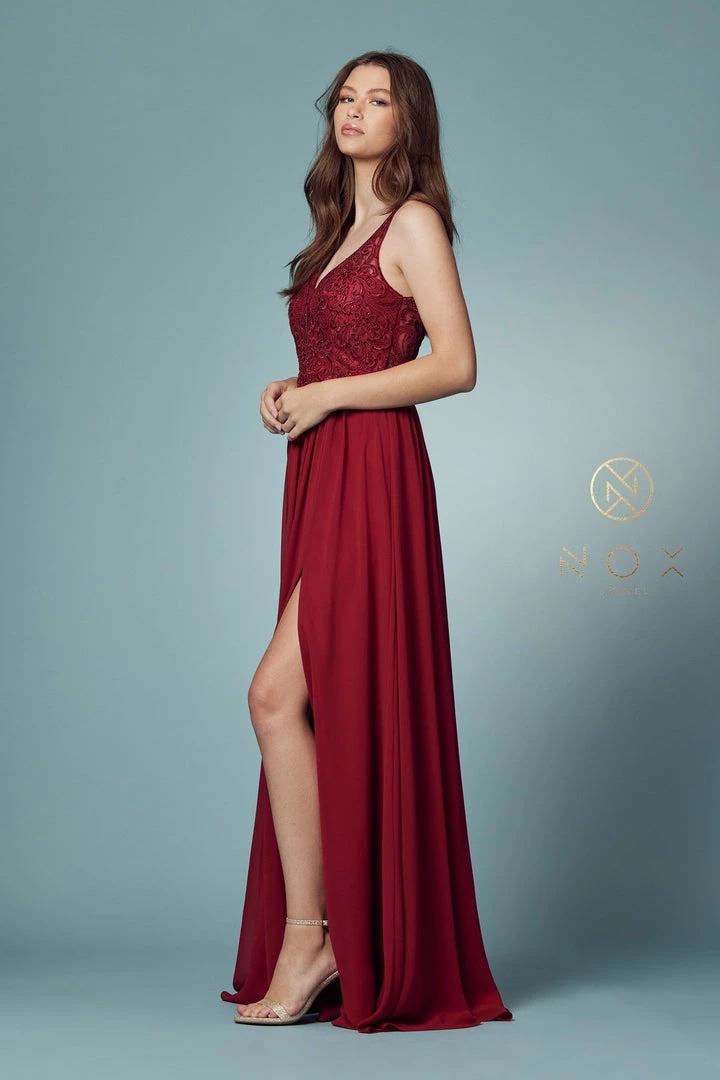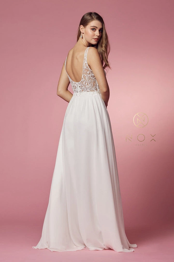 Look picture-perfect in this long sleeveless A-line dress with bead embroidered plunging sweetheart bodice by Nox Anabel Y299.