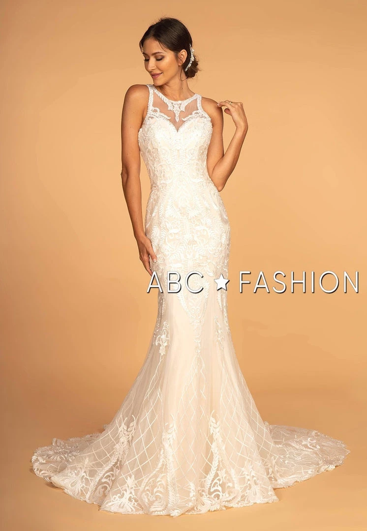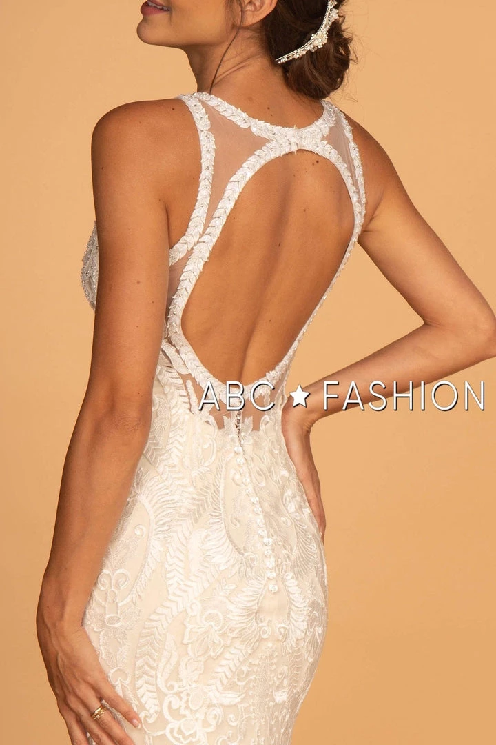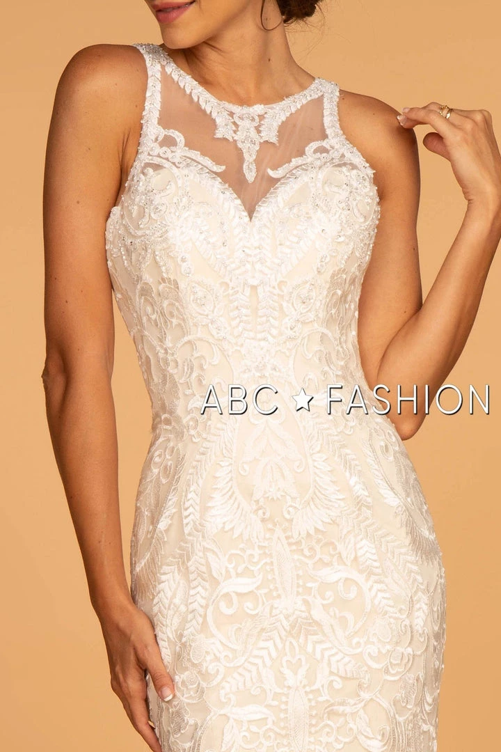 Dance the night away in this embroidered long sleeveless illusion dress with mermaid skirt by Elizabeth K GL2598 during your wedding or for any formal event. This beautiful sleeveless gown features a sheer sweetheart neckline adorned with elegant embroidered floral vine appliques accented with dainty beads, embellished open back with cutout, the floor length mermaid skirt is completed with a sweep train, and a cover button closure.