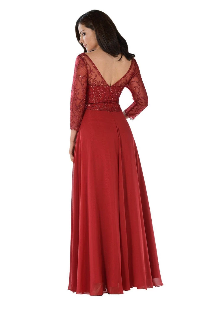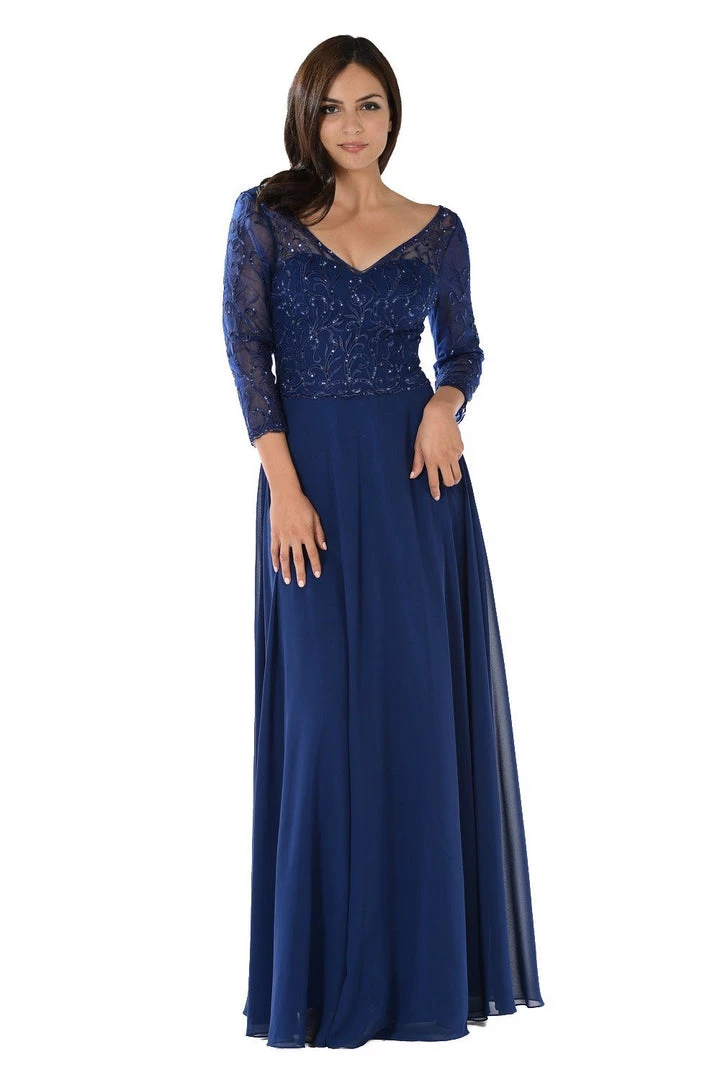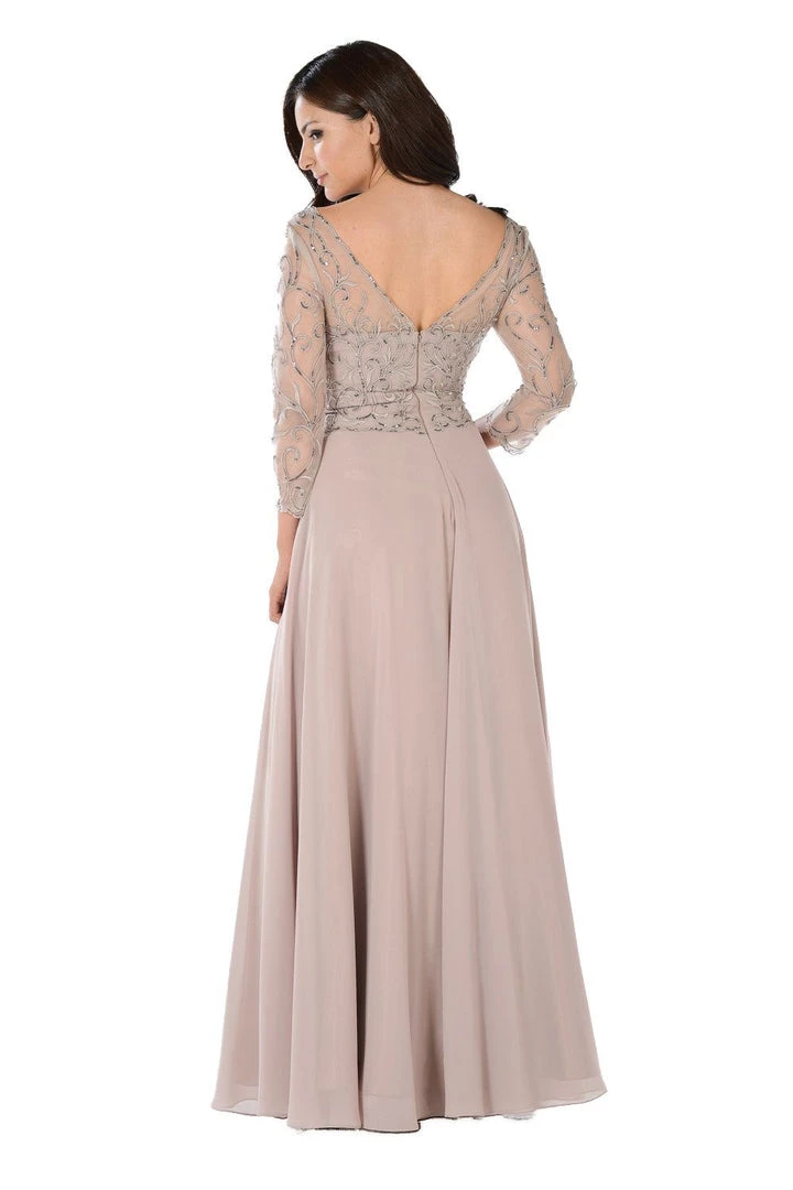 Look chic yet modest in this long embroidered beige chiffon dress with sheer mid-sleeves by Poly USA 7808. This long evening dress features an embroidered V-neck bodice that’s accented with sequins. An eye-catching embellished V-back, a full-length skirt, and a zipper closure complete this beautiful look. Perfect as a mother of the bride dress or for any formal event!