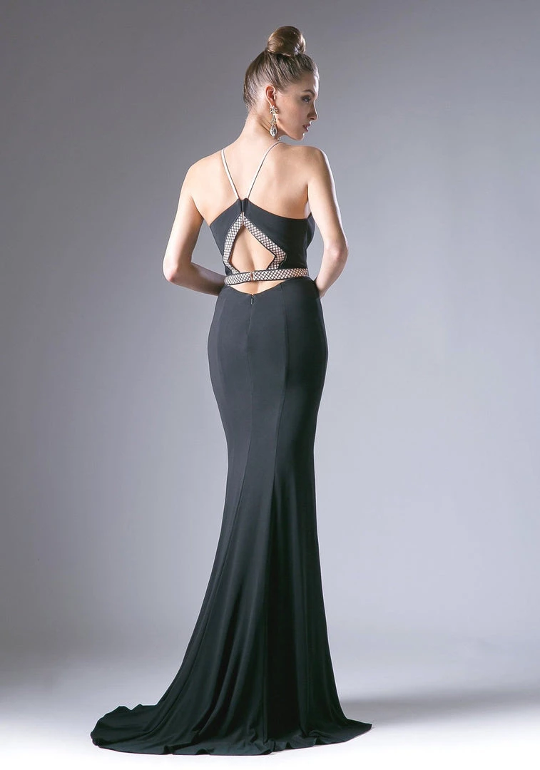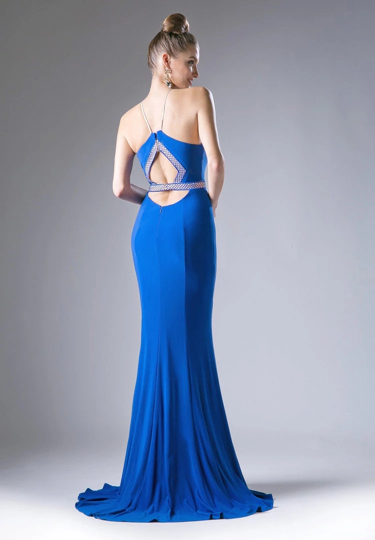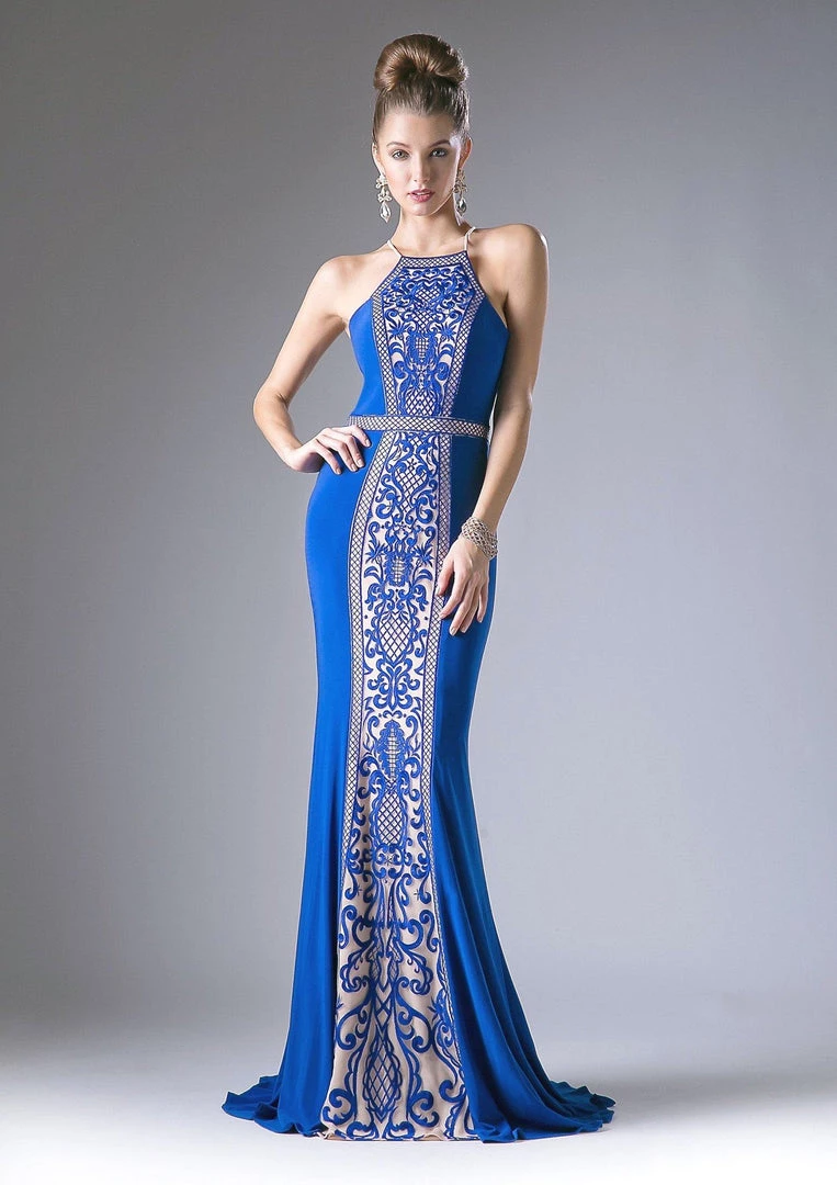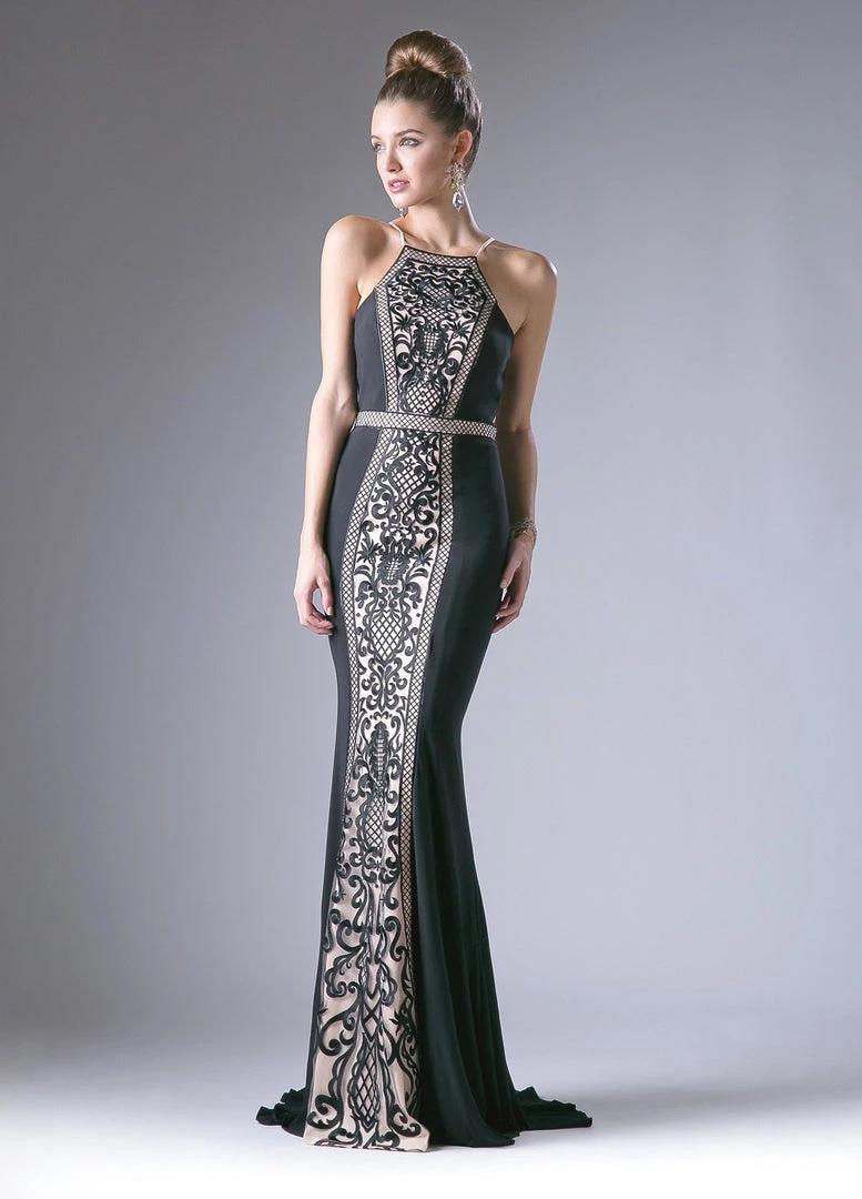 Make a grand entrance in this long embroidered high neck dress with open back by Cinderella Divine 83821.
