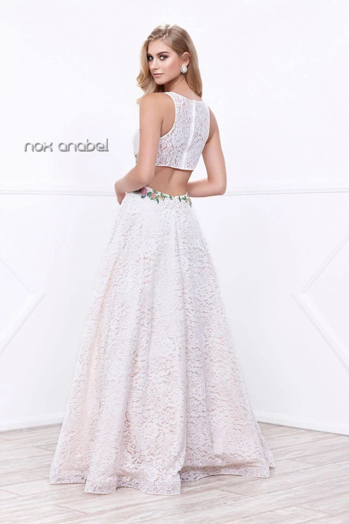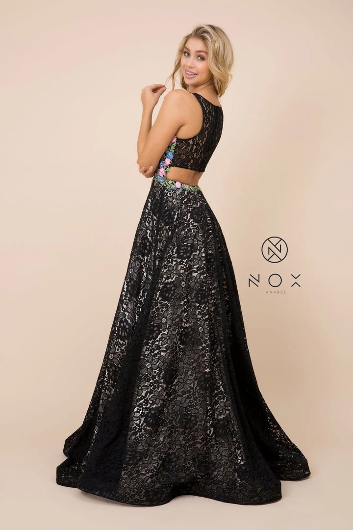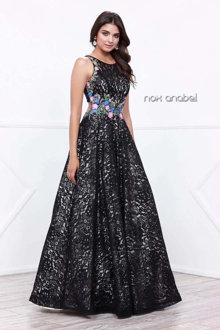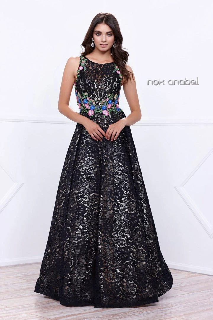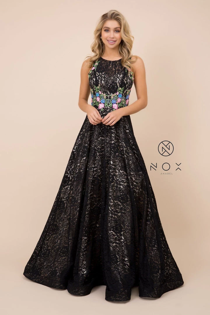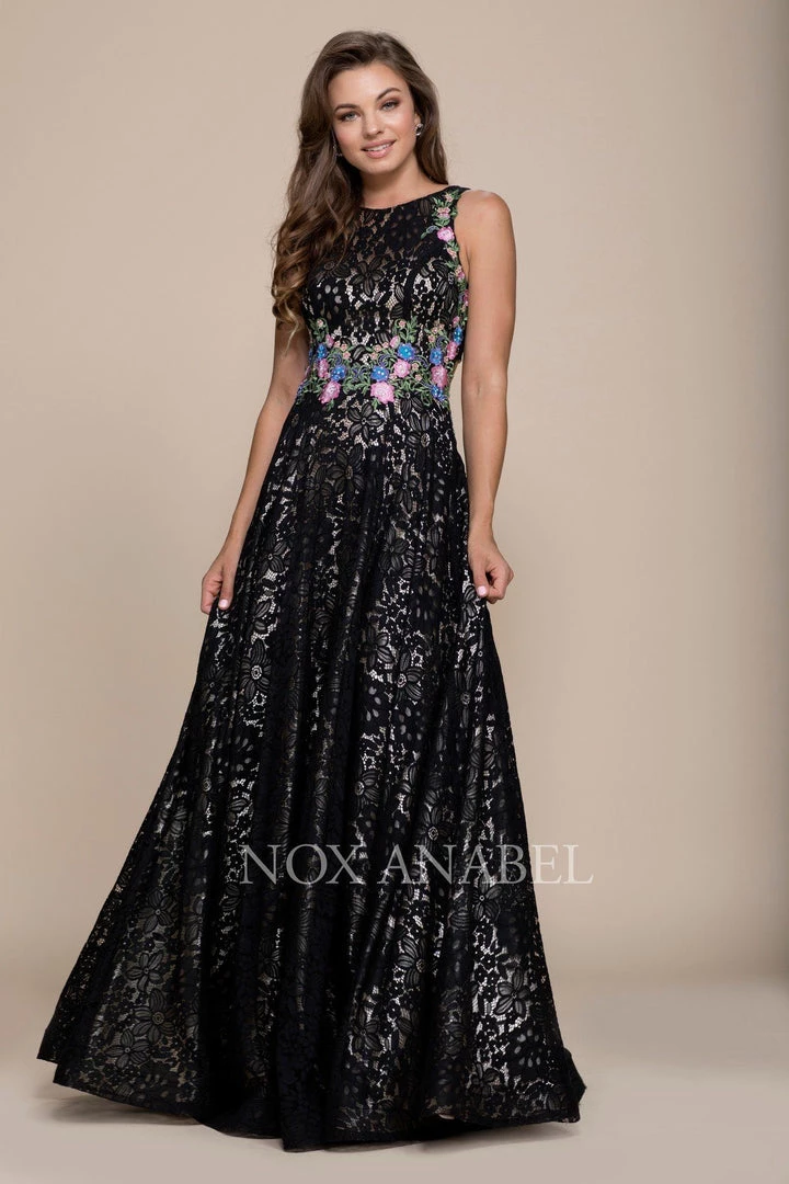 Look feminine and chic in a long sleeveless lace dress by Nox Anabel 8281. This long evening gown features a sleeveless bodice adorned with lovely lace appliques, beautiful floral embroidery, floor length A-line skirt with sweep train, and a zipper closure.