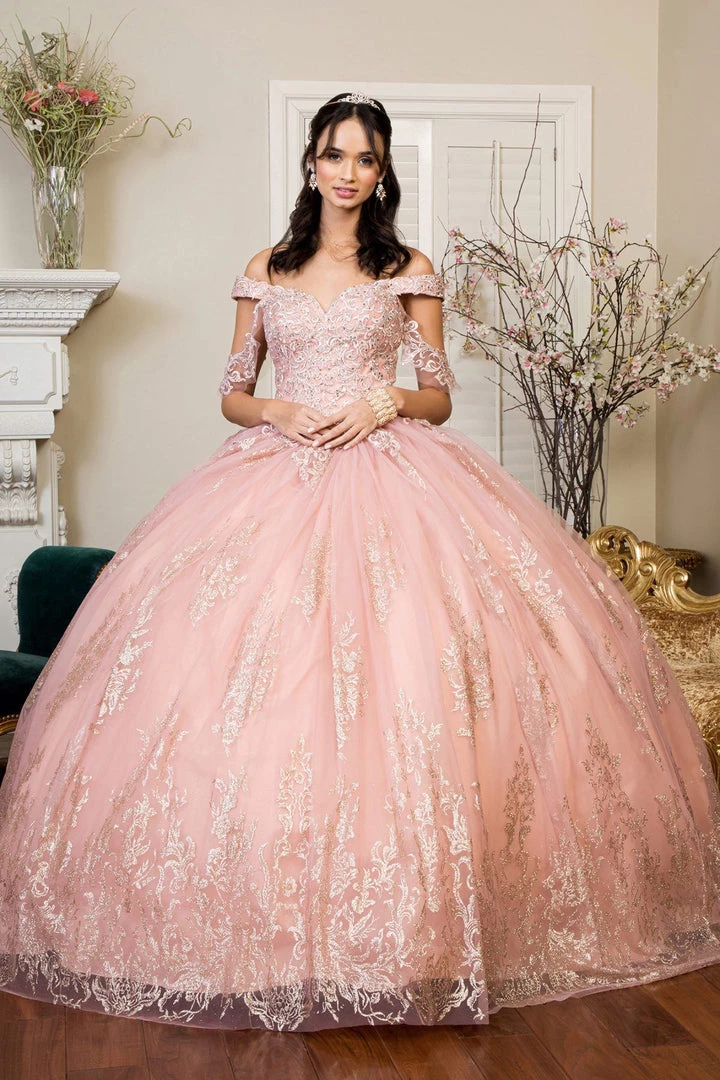 - Off Shoulder Sweetheart Glitter Mesh Quinceanera Dress