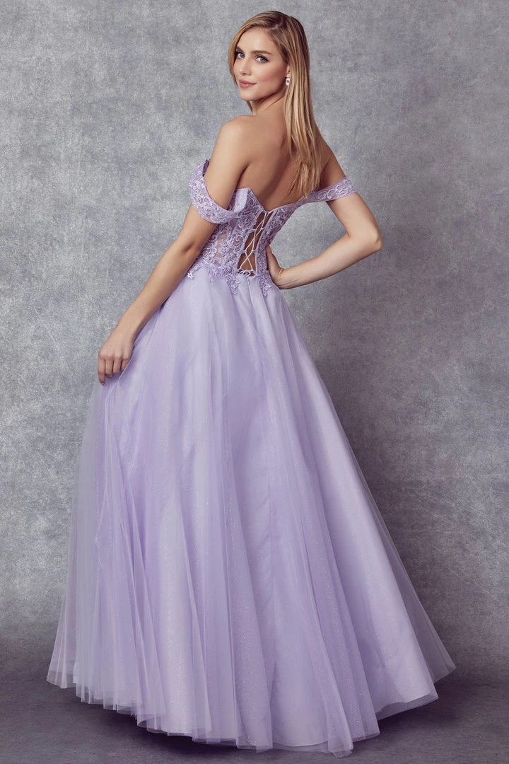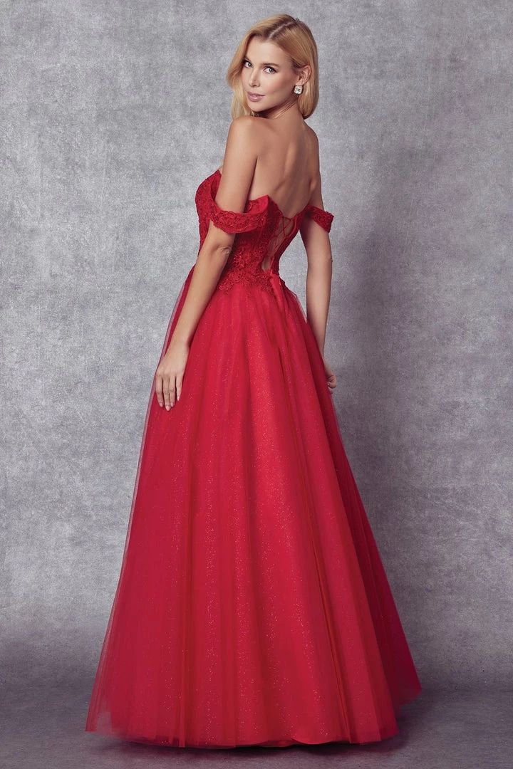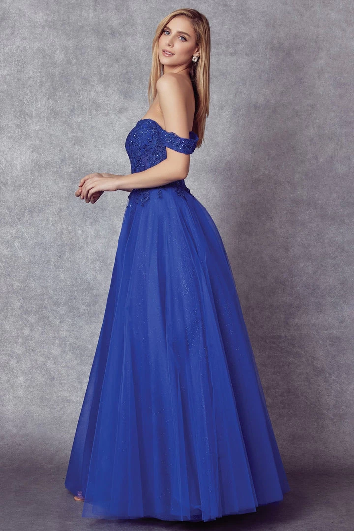 Show off your fashion sense in this long open back off shoulder dress with A-line shimmering tulle skirt by Juliet 280. This dress has a beautiful illusion embroidered bodice with sweetheart neckline. Open back and lace-up back with adjustable ties and zipper closure.