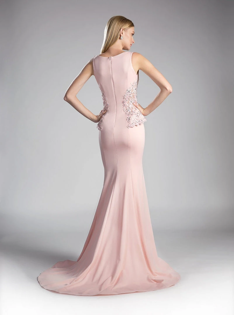 Look and feel beautiful in this long sleeveless mermaid dress with embroidered appliques by Cinderella Divine 5031. This evening gown features a beautiful sleeveless V-neck bodice, the side sheer cutouts are covered with beaded embroidery, peplum details, an enclosed back, a floor length mermaid skirt with a small train, and a zipper closure.