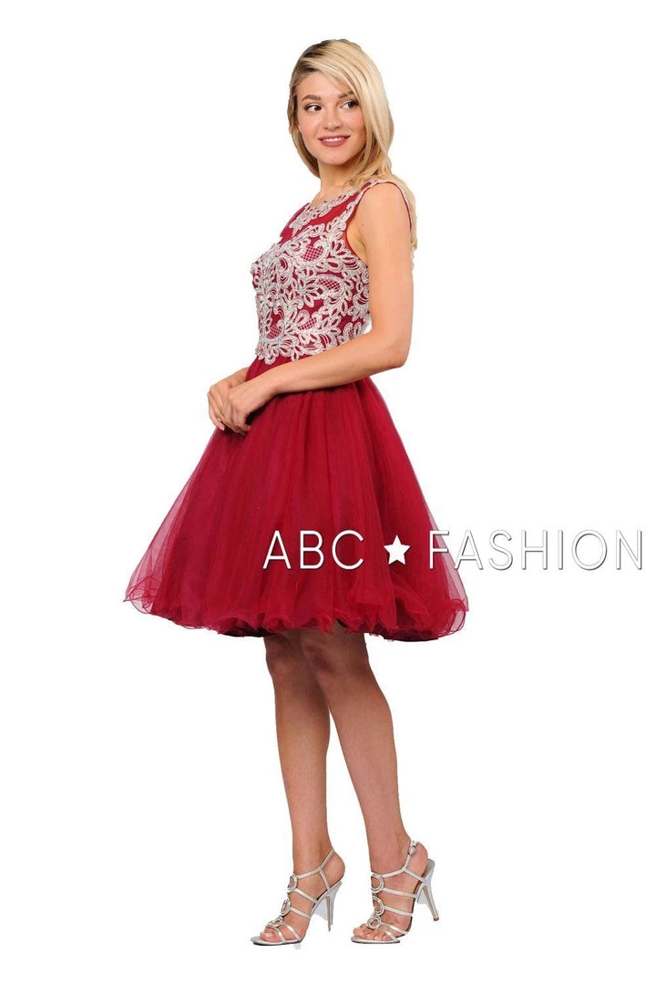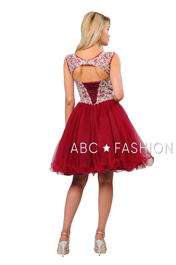 You’ll love twirling around in this applique sleeveless ruffled cocktail dress with corset back by Poly USA 8302. This short party dress features a sheer sweetheart bodice embroidered with shimmery appliques, corset lace-up back with a keyhole cut-out, and a short A-line ruffled skirt with curly hemline. Affordably priced under $150, this dress is perfect for any semi-formal event and will keep you on budget!