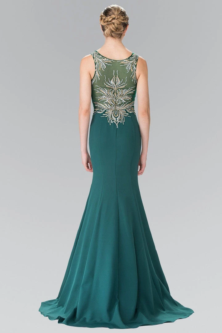 Be a trendsetter in this long bead embroidered sleeveless illusion dress by Elizabeth K.
