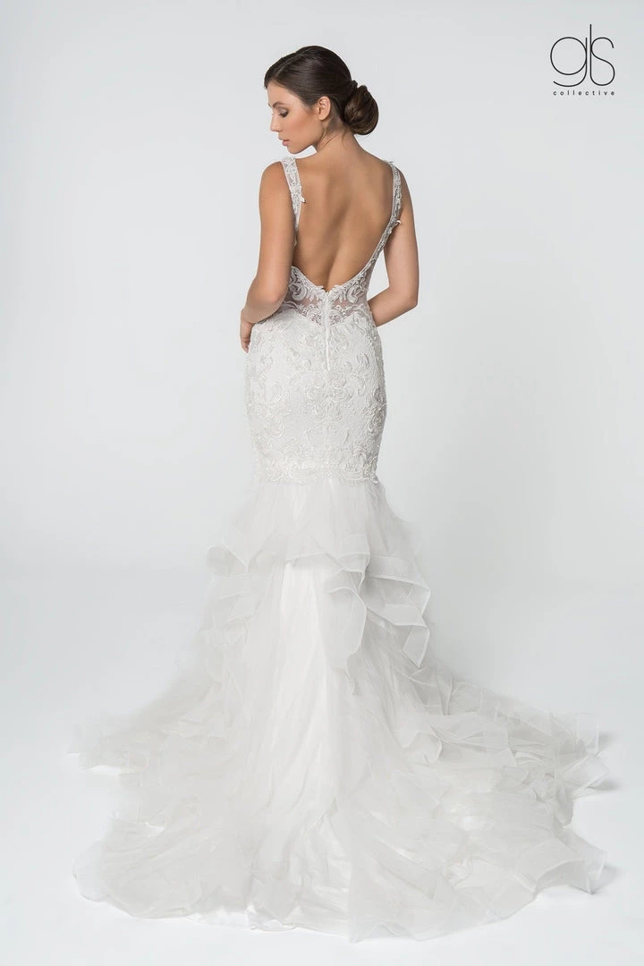 Look breathtaking in this long embroidered V-neck wedding mermaid dress with ruffled train by Elizabeth K GL2814.
