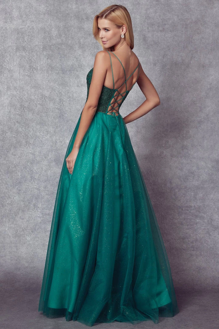Be the center of attention in this long sleeveless lace up dress with A-line skirt by Juliet 268. This dress is adorned with v-neckline embroidered bodice and stone accents with sparkle tulle skirt to capture your audience. This dress has side pockets and lace up back with adjustable straps and zipper closure.