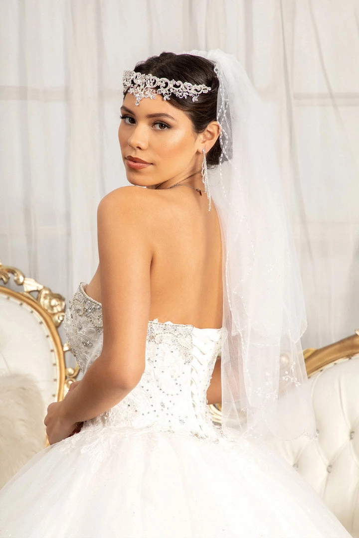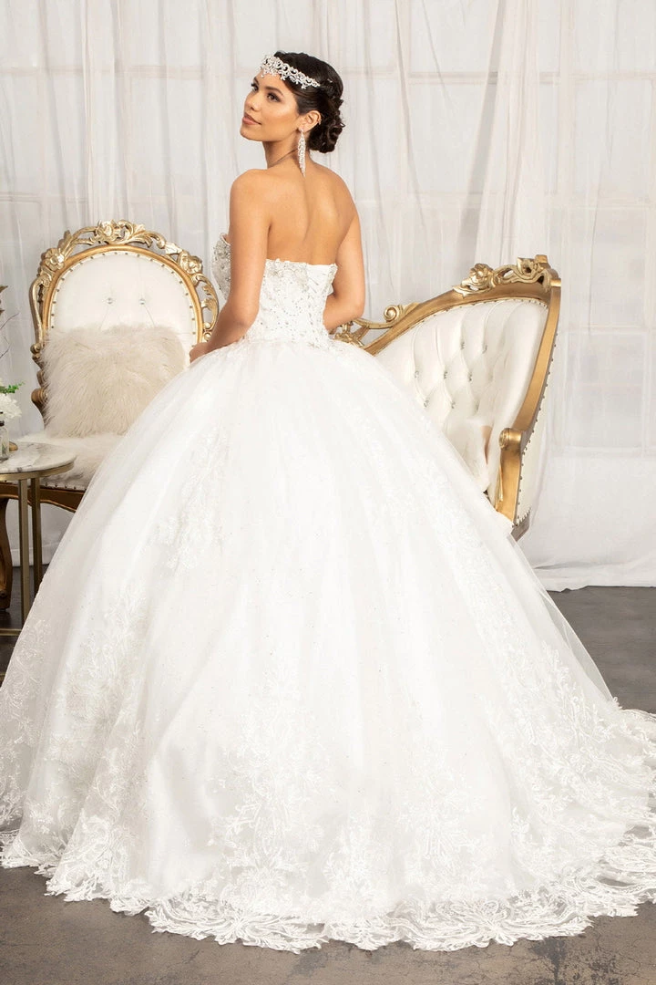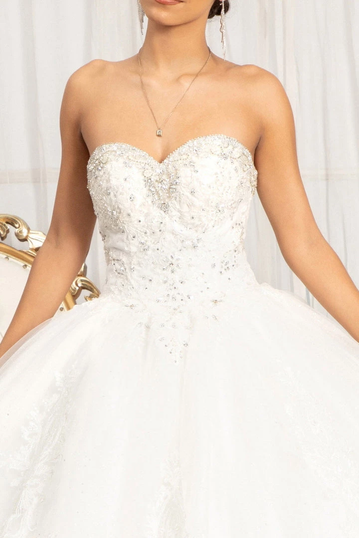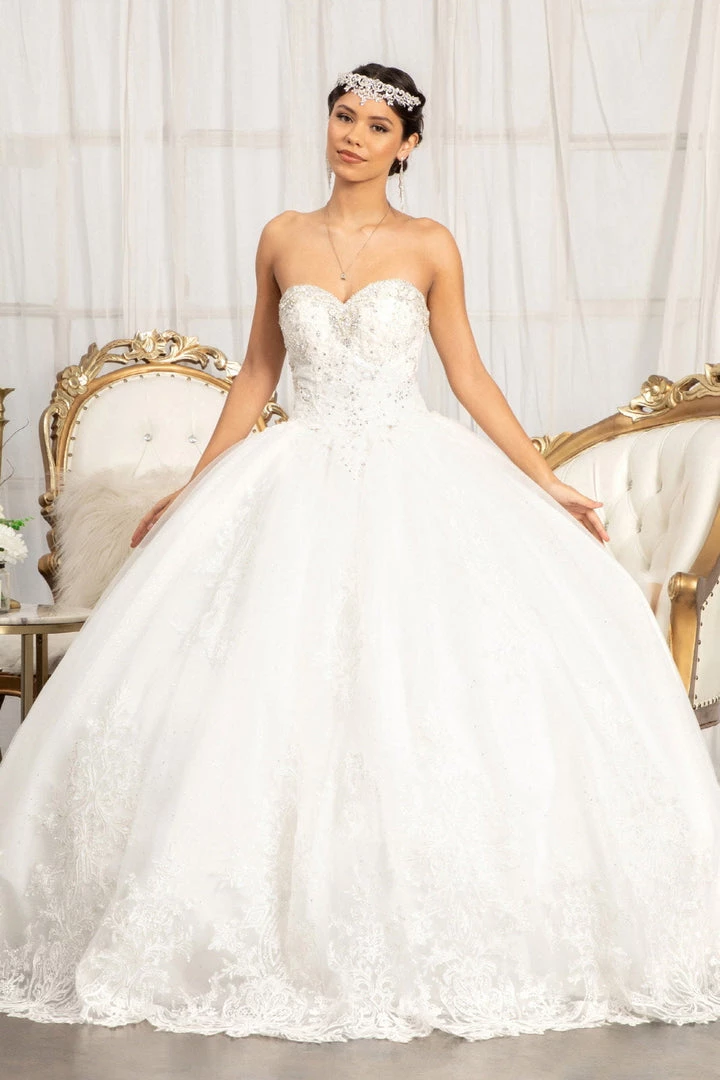 Look timeless in this embroidered long strapless dress with A-line skirt by Elizabeth K GL3017. This beautiful ballgown features glitter embroidery with lace appliques embellishments and a sweetheart neckline with a corset back gives a classic glam vibe.