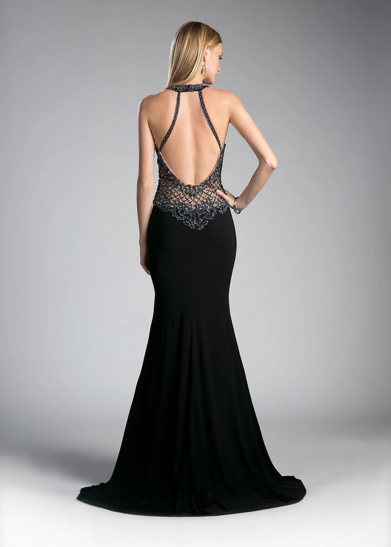 Turn heads in this beaded halter gown with train by Cinderella Divine KD012. This sexy gown gives the appearance of a completely sheer bodice. Transparent chiffon covers the nude lining creating a sweetheart neckline with a halter top overlay. The bodice is covered in intricately embellished bead work that cascades into the floor length skirt. The open back adds to the sexiness of this gown.