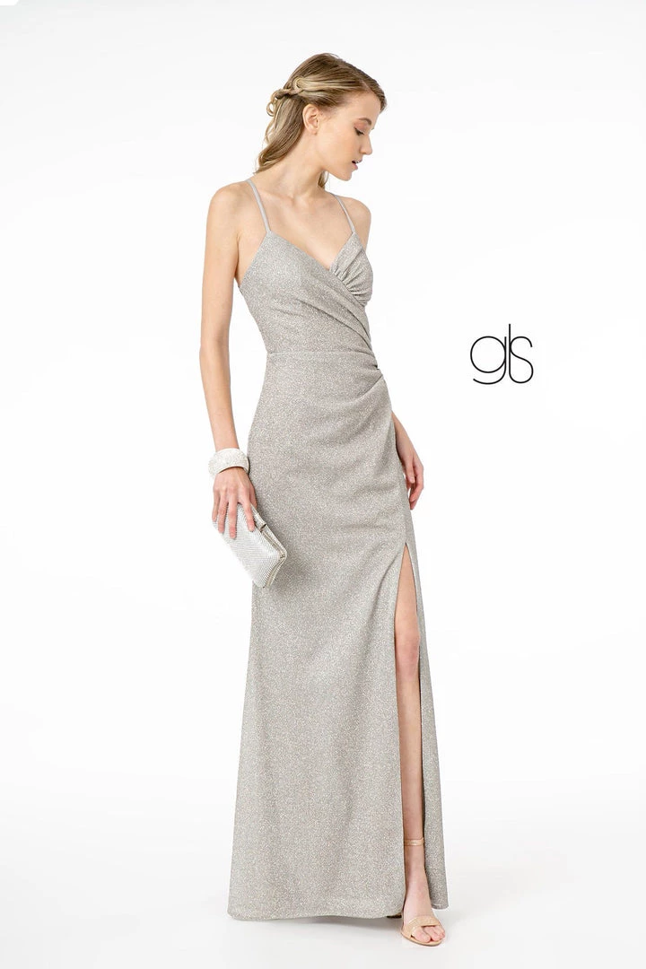 Make a statement in this metallic glitter long sleeveless V-neck dress with fitted skirt by Elizabeth K GL1831. Affordably priced at $139, this gown is perfect for any formal event and will keep you on budget!