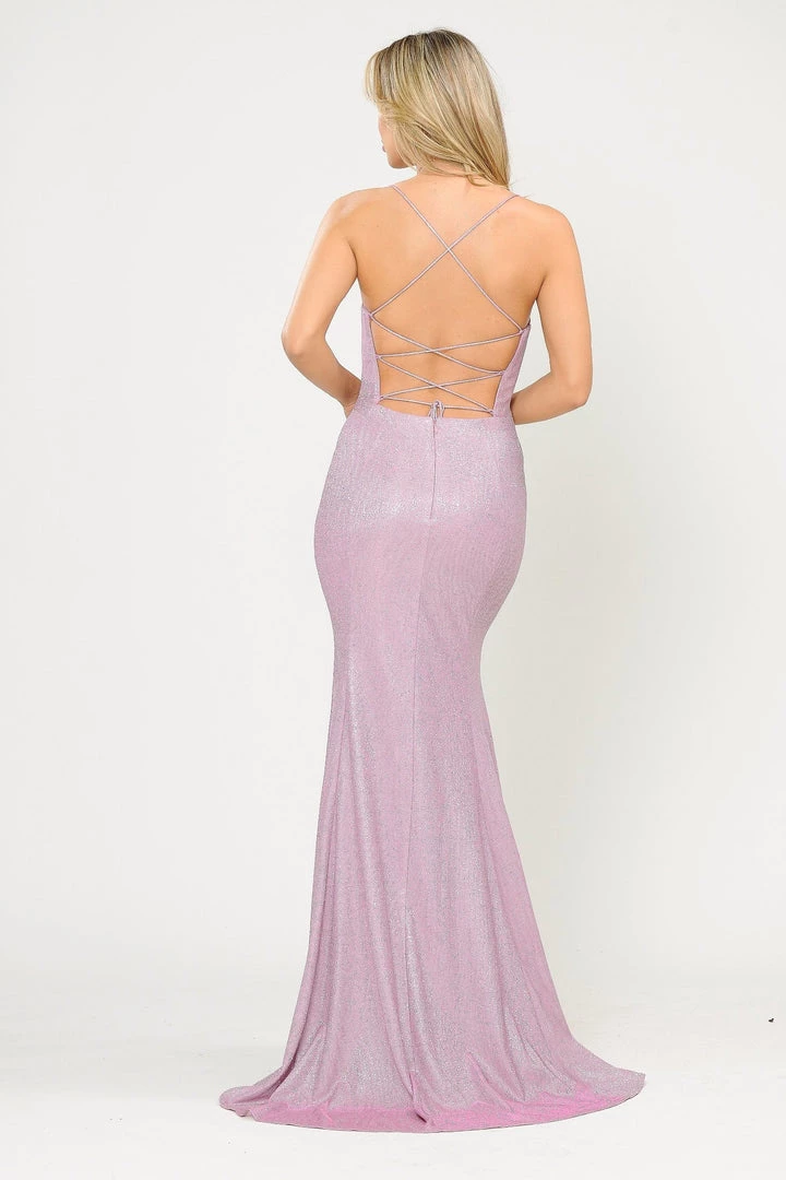Be a trendsetter in this long mermaid iridescent glitter dress with corset open back by Poly USA 8668. This beautiful formal gown features a spaghetti strap sleeveless bodice with illusion V-neckline, flirty crisscross open corset back, floor length trumpet skirt with a small train, and a lace-up back. Affordably priced under $200, this long evening dress is perfect for any formal event and will keep you on budget!
