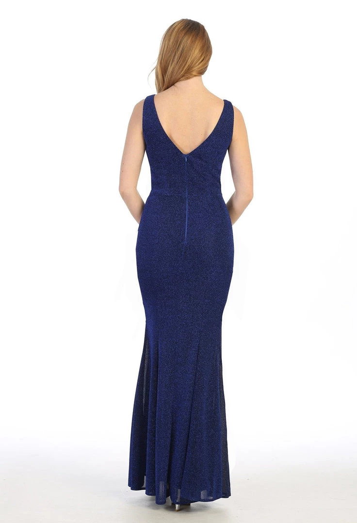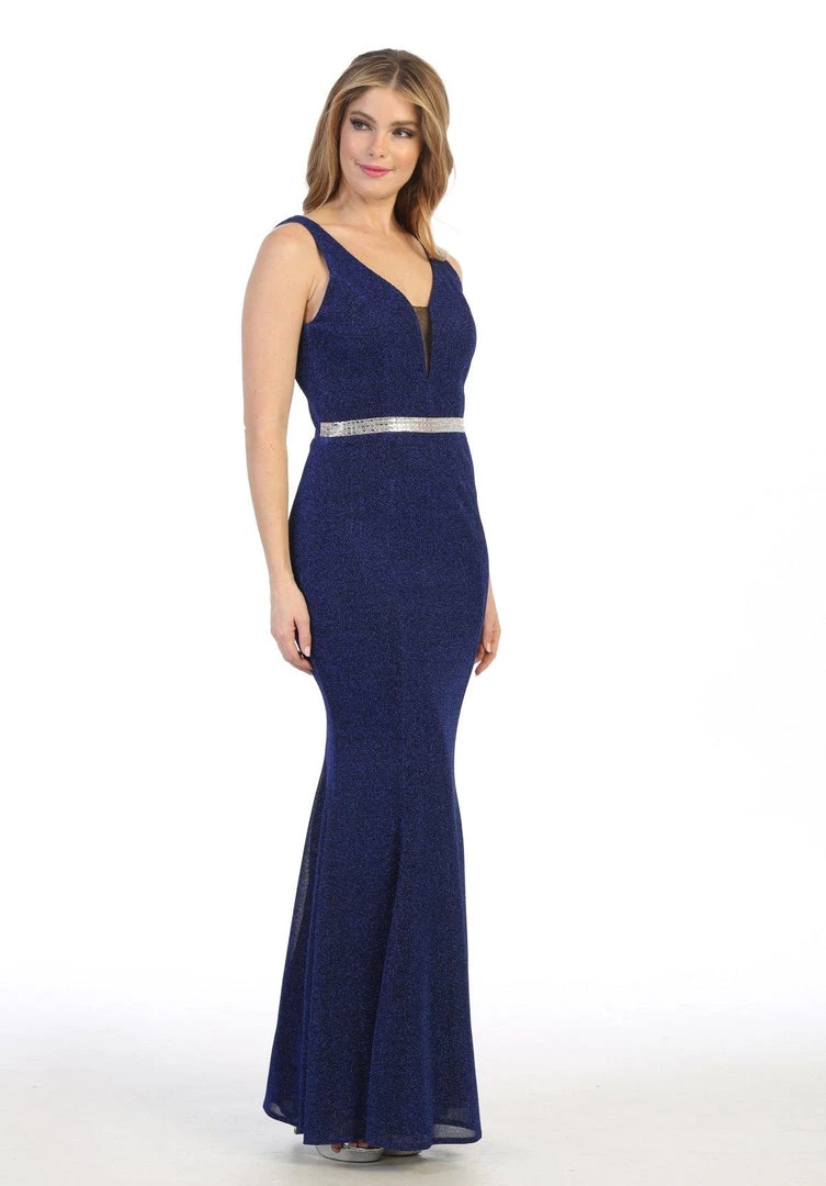 Look unforgettable in this sleeveless metallic glitter mermaid dress by Celavie 6483L. Long sleeveless fit and flare metallic glitter dress with illusion V-neckline, rhinestone embellished waistband, open V-back, and a zipper closure. Affordably priced at $139, this evening gown is perfect for any formal event and will keep you on budget!
