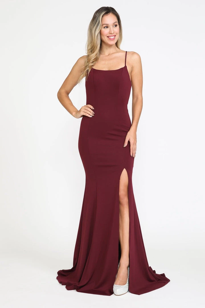 Look chic in this long fitted jersey dress with corset back by Poly USA 8376. This beautiful gown features a sleeveless square neck bodice supported with spaghetti straps, flirty open back with crisscross ties, floor length form fitting skirt with a sweep train, side leg slit, and a lace-up back with zipper closure.