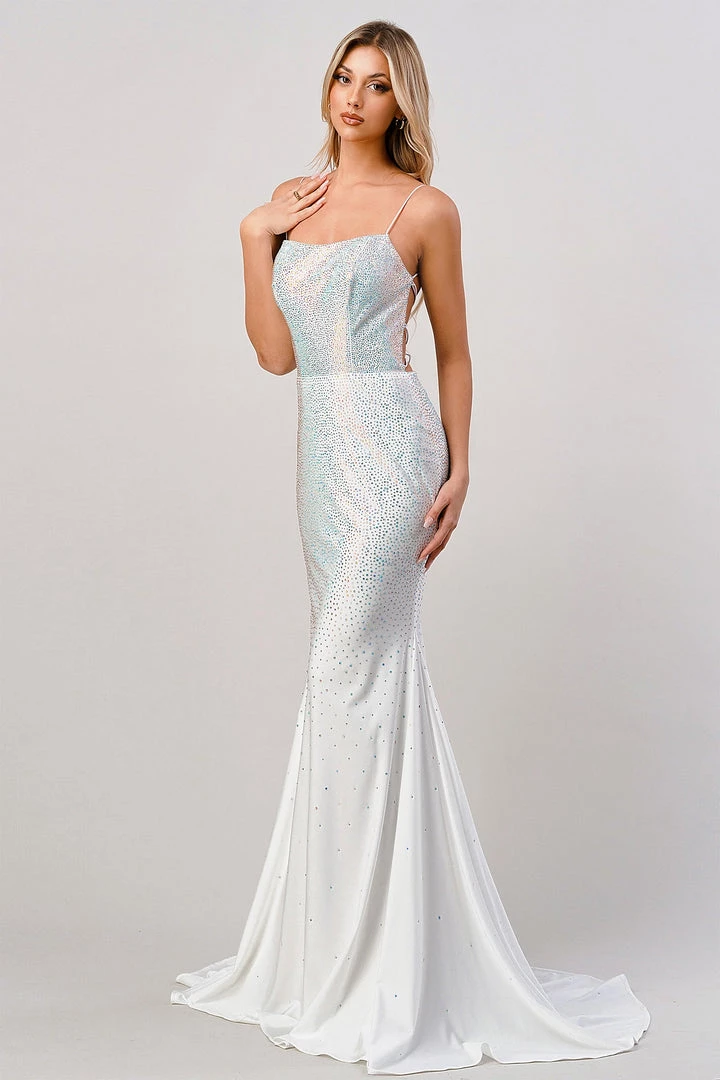 Dazzle the room in this embellished long strappy back dress with fitted skirt by Cinderella Divine CD0179. Cut from radiant stone embellished stretch satin, this gown makes the perfect statement. A straight neckline is held up by thin sturdy adjustable straps that lace up on the low cut open back. Hot stones ombre in scarcity from bust to train.