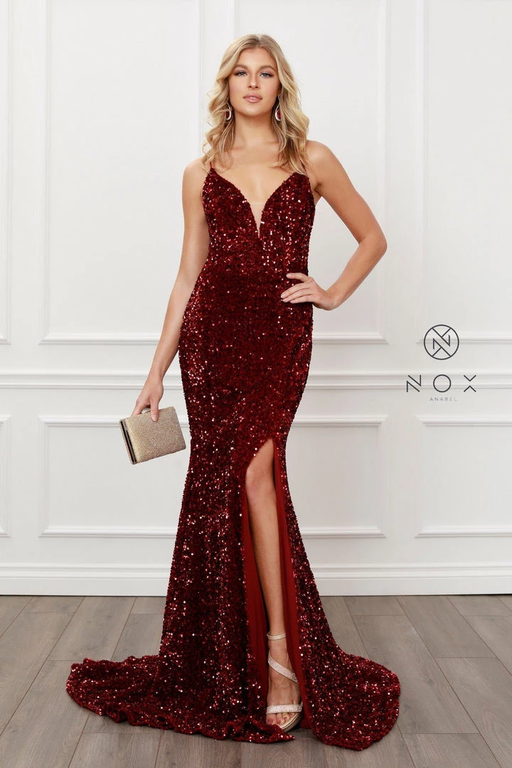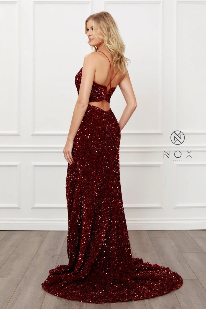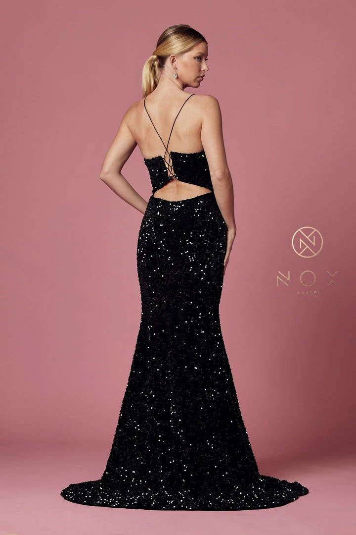 Dazzle the room in this long sleeveless sequin fitted velvet dress with back cutout by Nox Anabel R433. Made out of gorgeous sequined velvet, this mermaid gown features a deep plunge V-neckline and modern spaghetti straps.