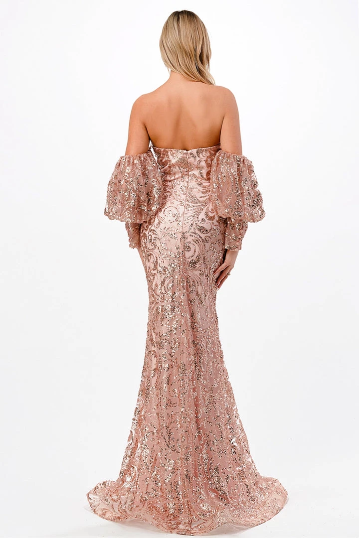 Look unforgettable in this fitted long strapless glitter print dress Cinderella Divine J820. Glimmering in scroll print, this beautiful gown features a strapless sweetheart neckline, illusion side cutouts, and detachable avant-garde puff sleeves. With a snug fit, this mermaid dress flares out at the train for a dramatic entrance.