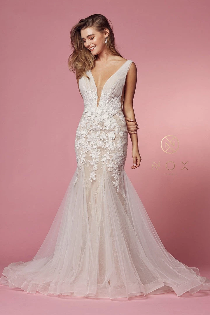 - Floral Applique Mermaid Bridal Gown by Nox Anabel JE917