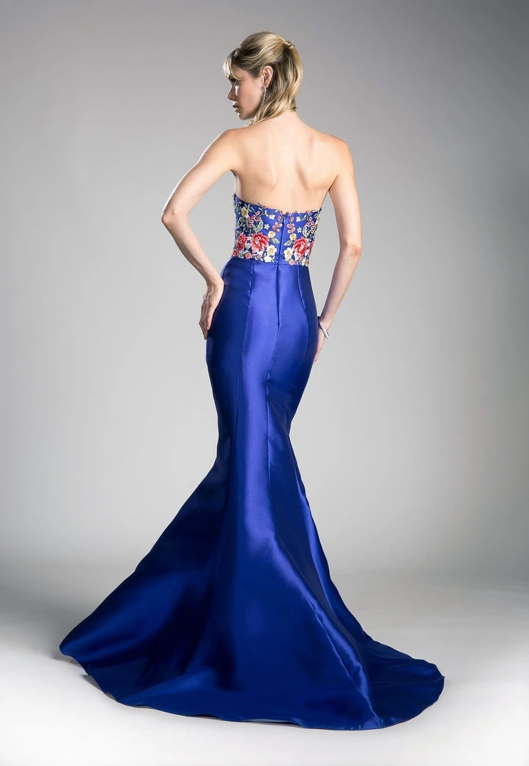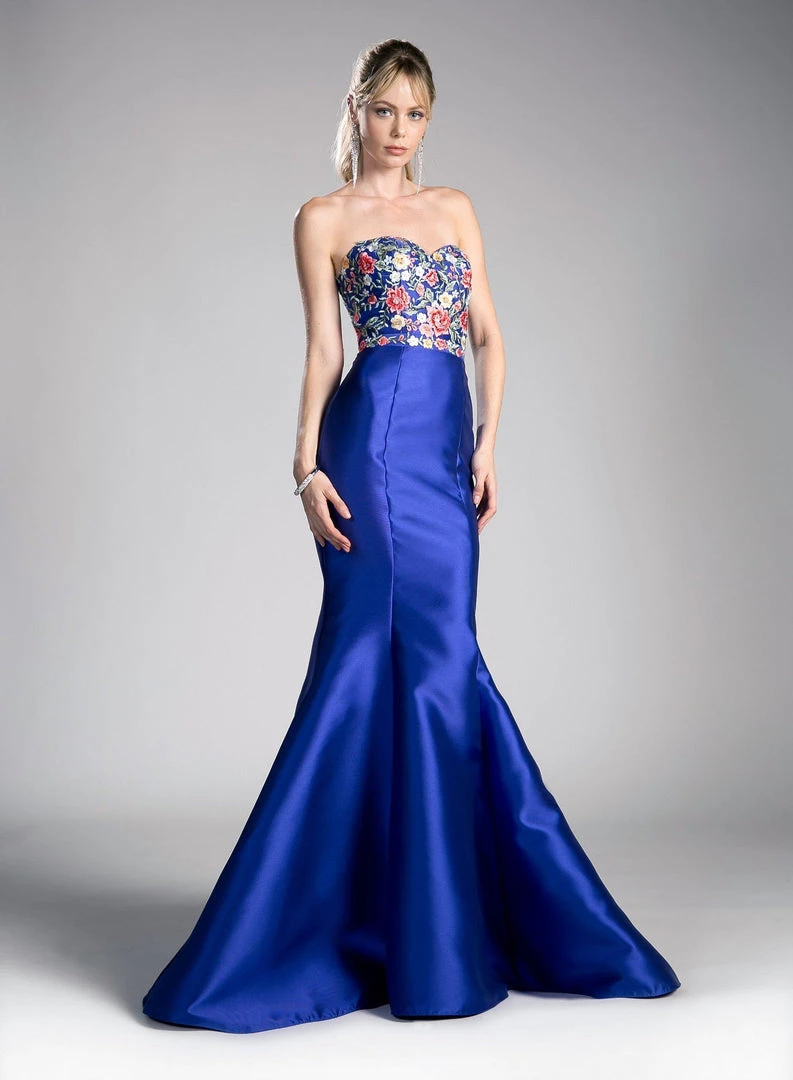 Enjoy your night in this strapless satin mermaid gown with floral embroidered bodice by Cinderella Divine HW06. This evening dress features a sweetheart strapless bodice with beautiful floral embroidery, floor length mermaid skirt that flares out to a gorgeous sweep train, and a zipper closure.