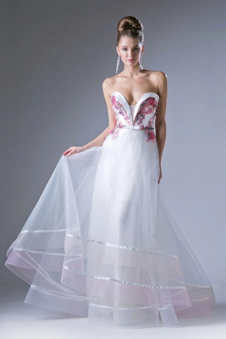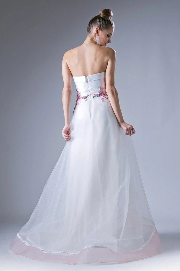 Look unforgettable in this pink floral appliqued long strapless dress with A-line tulle skirt by Cinderella Divine G1024.