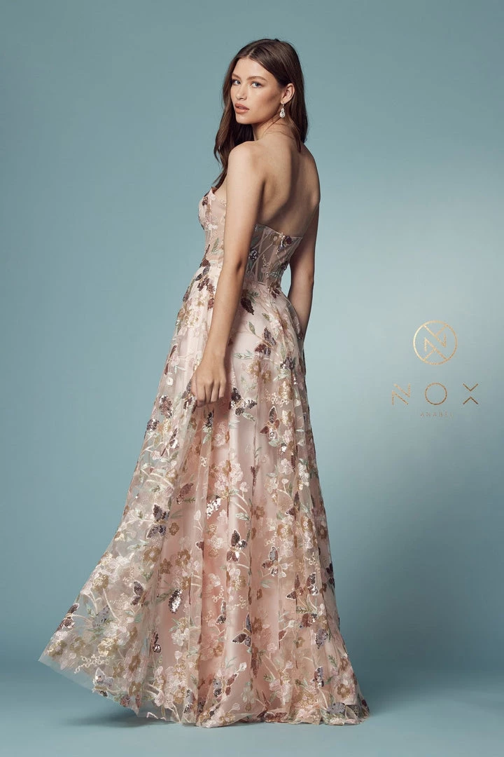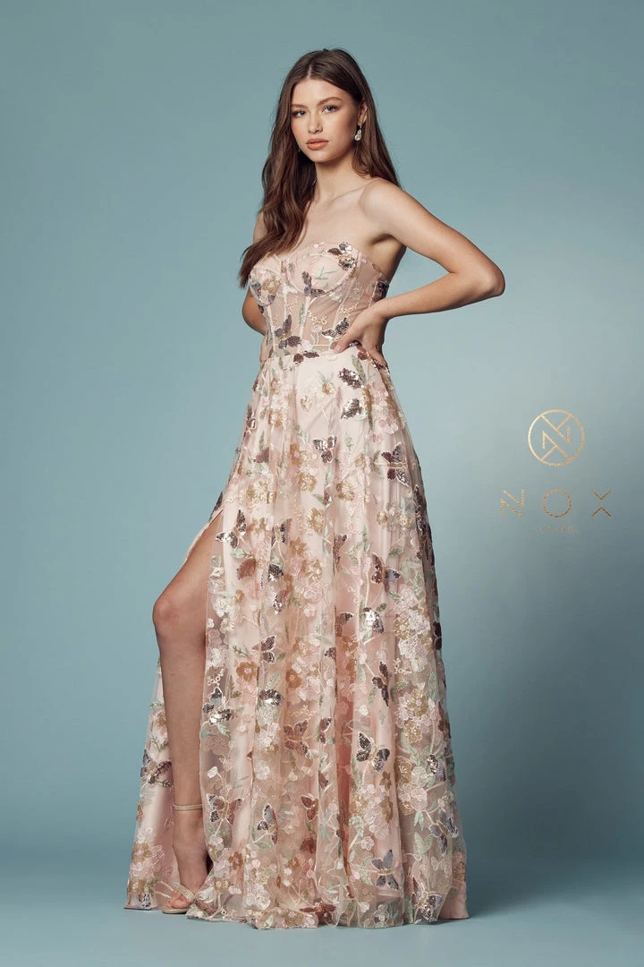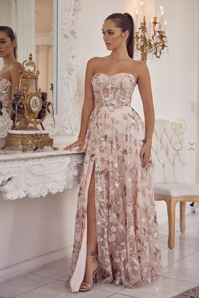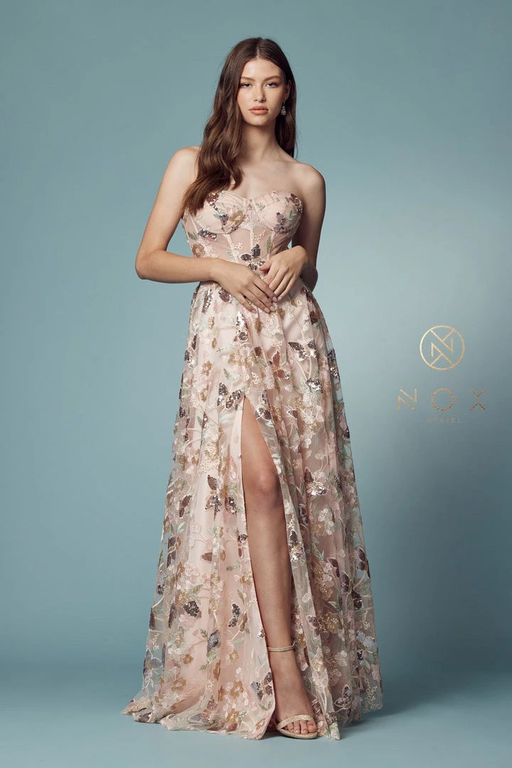 Dance the night away in this floral applique long strapless dress with A-line skirt by Nox Anabel E1001. This beautiful strapless features a sweetheart neckline with sheer bodice adorned with floral applique. You’ll love twirling in this that has a leg slit with open back with zipper closure and sweep train.