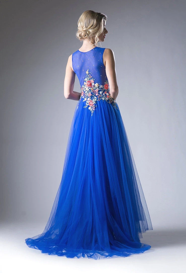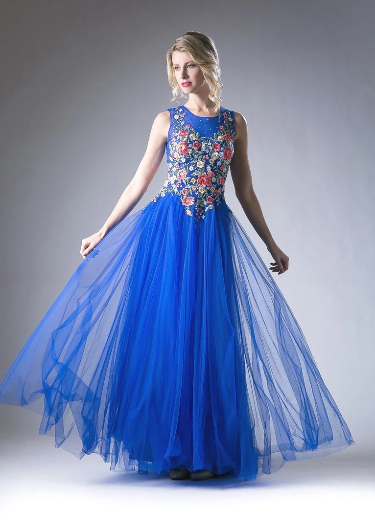 Dazzle the room in this floral embroidered long sleeveless dress with A-line skirt by Cinderella Divine HW15.