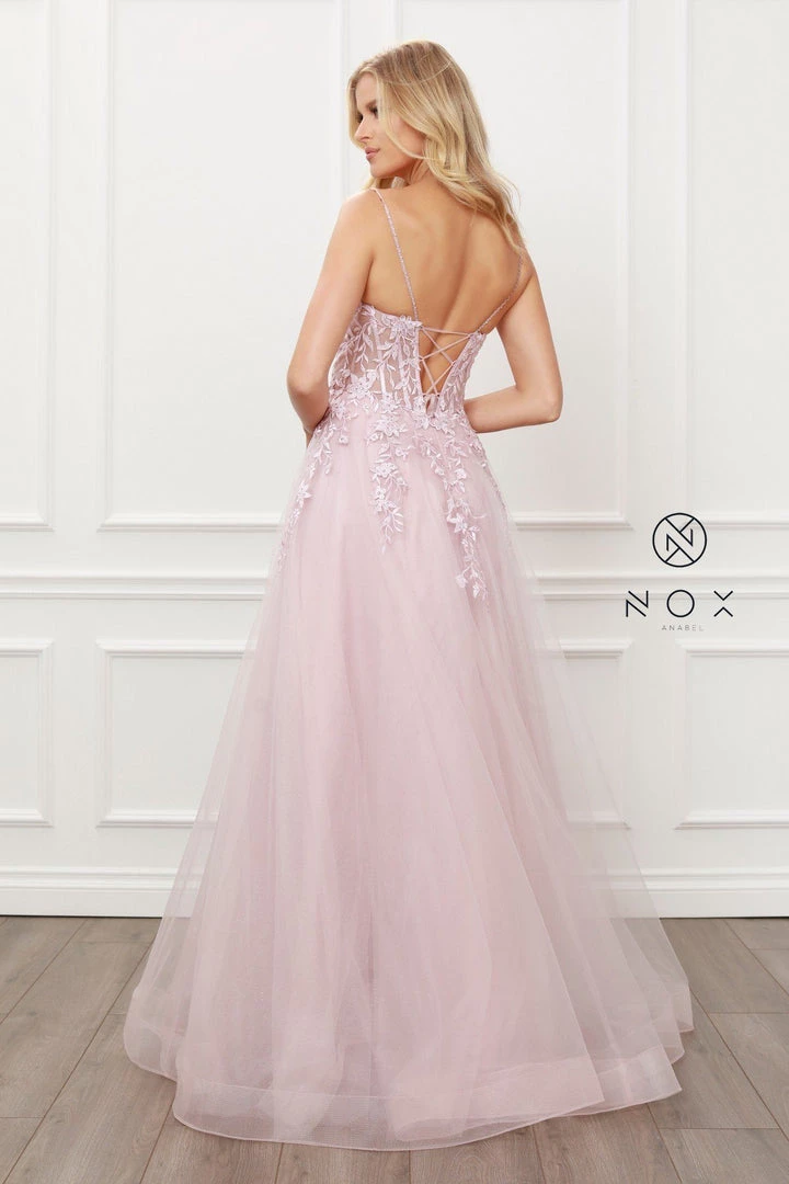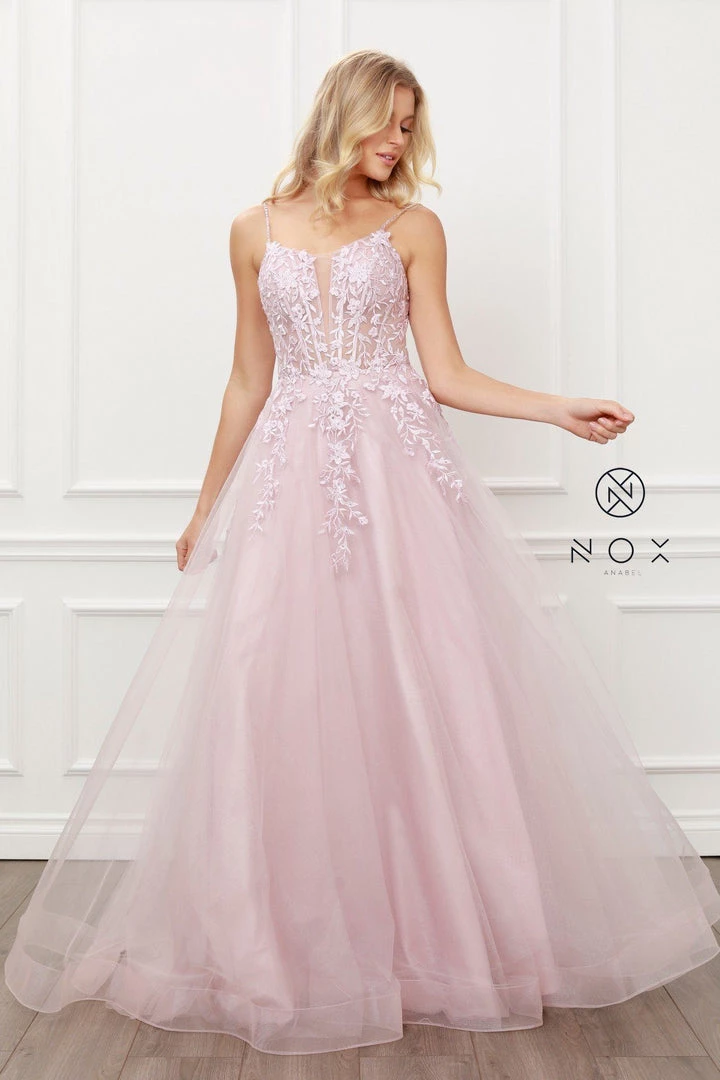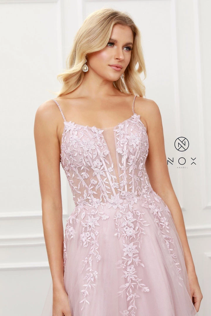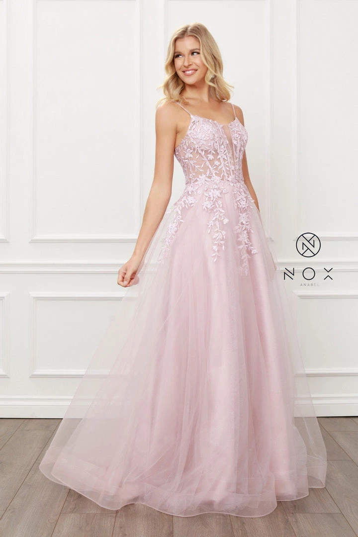Dance the night away in this floral applique long tulle dress with A-line skirt by Nox Anabel T449. This gown brings on the glam with the floral appliques adorning the fitted see-through bodice and dreamy tulle skirt.