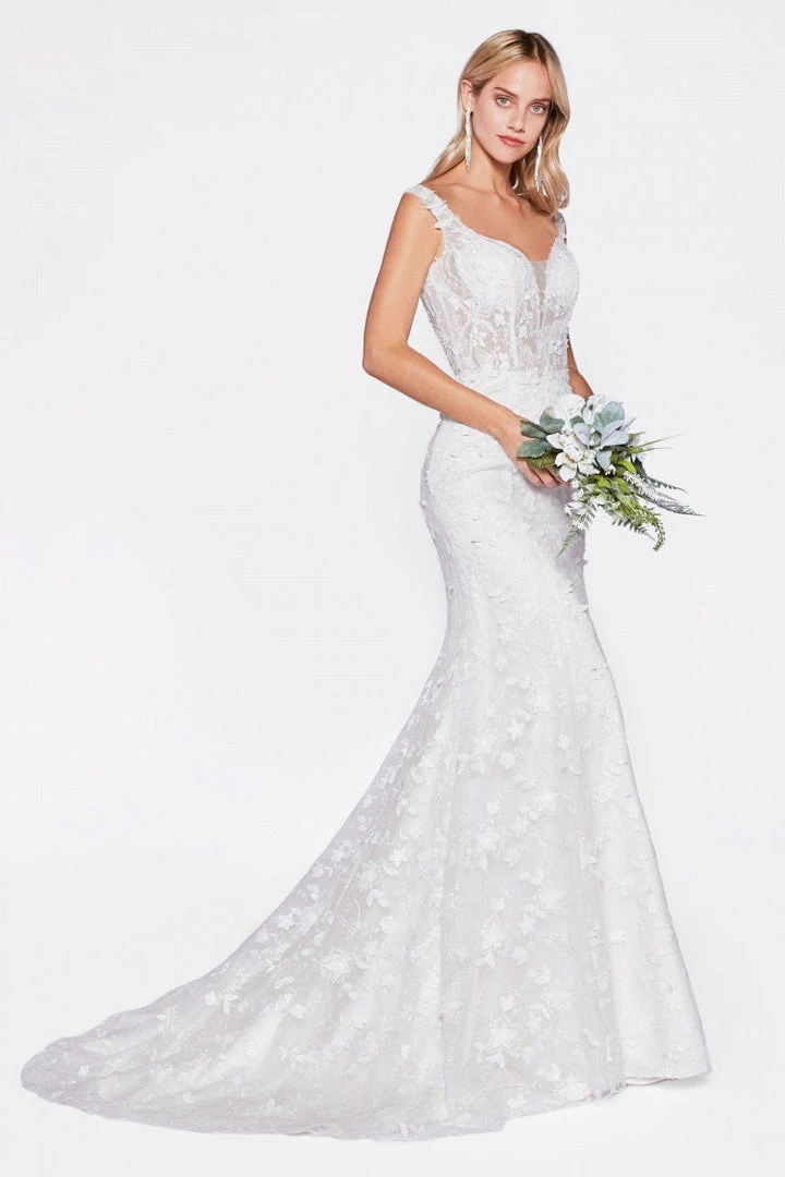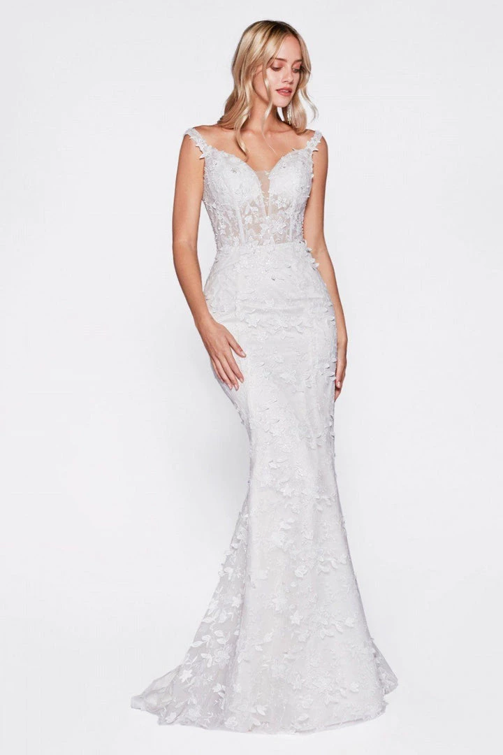 - Fitted bridal gown with 3D floral appliques and corset structured bodice
